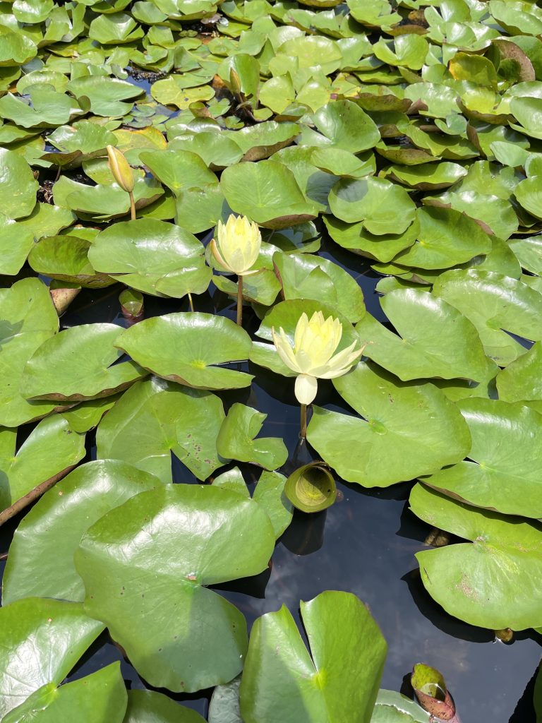 Alternative Text: A serene water scene featuring green lily pads floating on dark water, with two blooming yellow water lilies and one closed bud, surrounded by a vibrant leaf canopy.