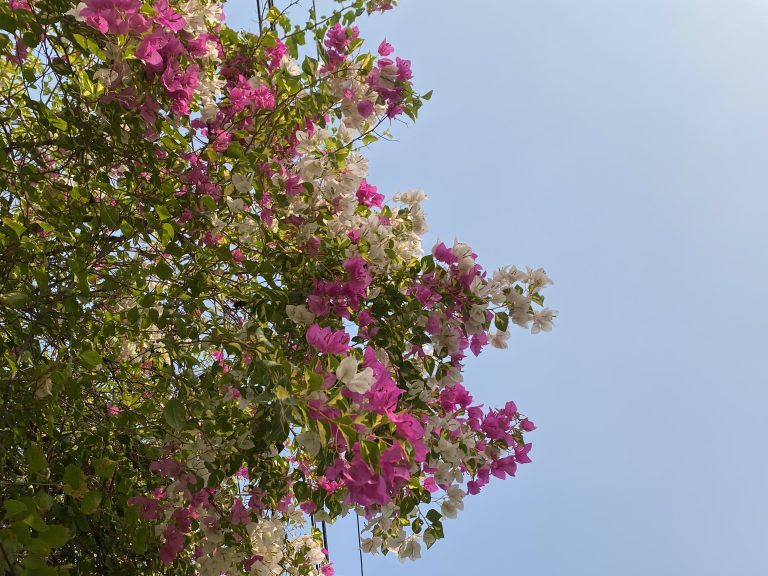 Alternative Text: A vibrant display of bougainvillea flowers in shades of pink and white, contrasting against a clear blue sky.