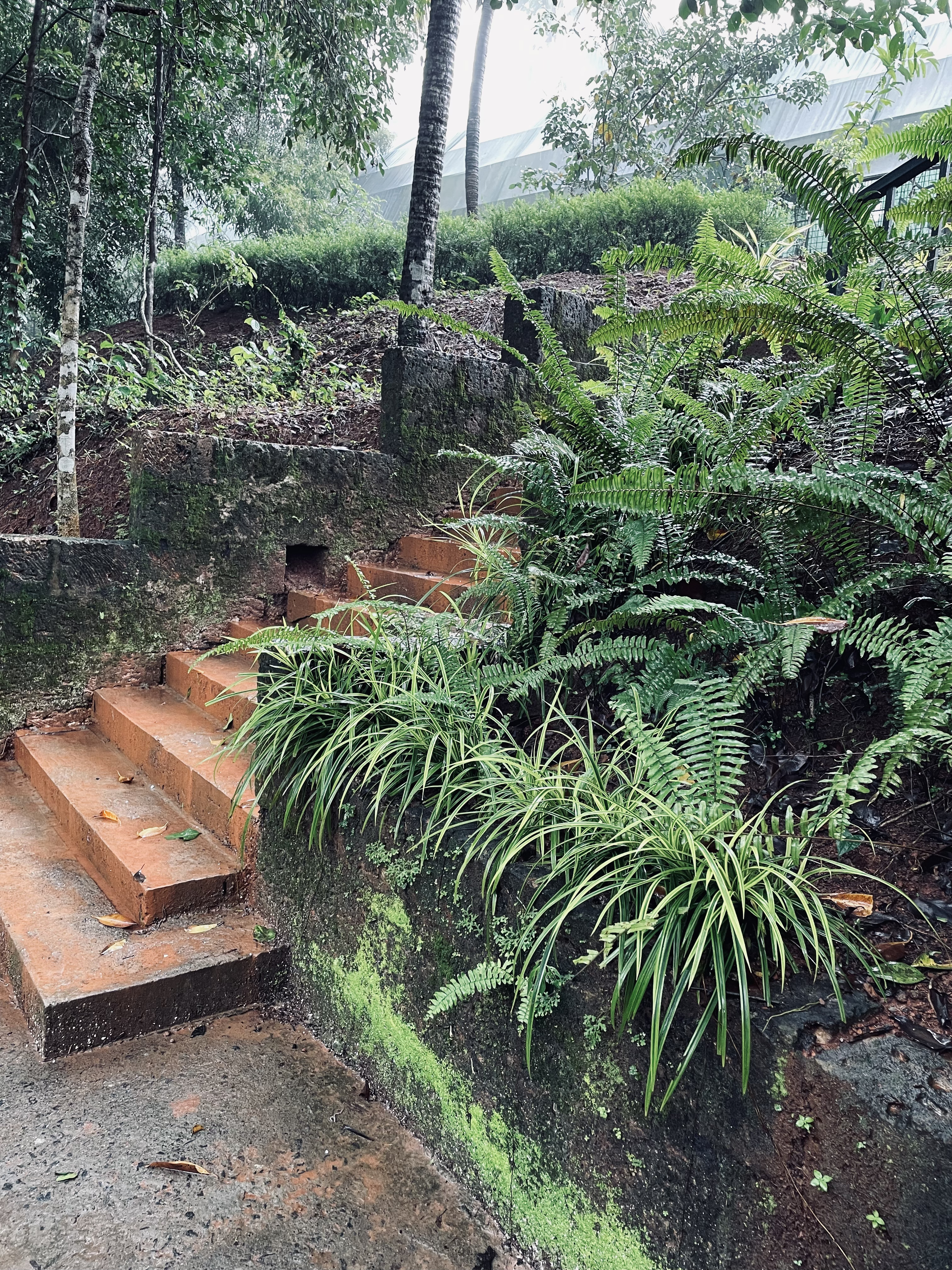 Alternative Text: Stairway surrounded by lush ferns and moss-covered stones, leading into a serene forested area with a hint of a canopy in the distance