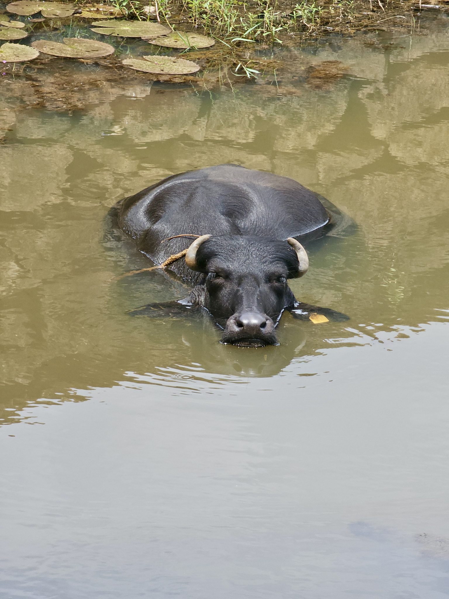 Alternative Text: A close-up shot of a buffalo resting in a pond, with only its head and upper body above the water. The calm expression and natural setting add a peaceful feel. Captured near Vazhakkad, Malappuram.
