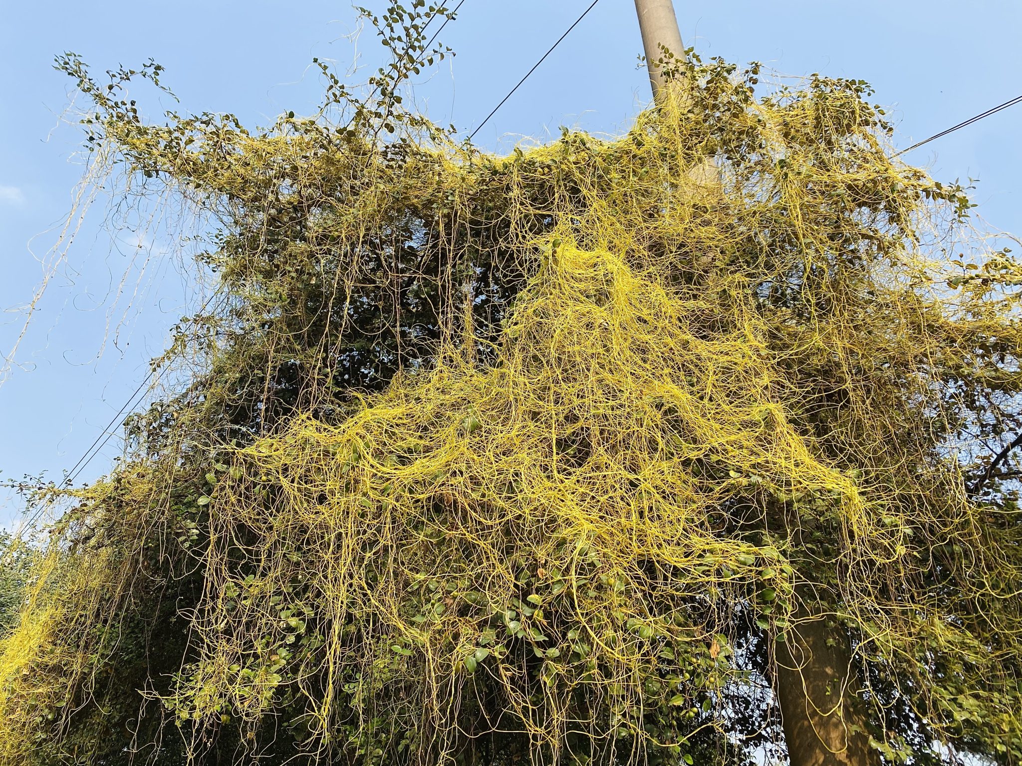 Alternative Text: Bright yellow vines cover green foliage and a utility pole under a clear blue sky.
