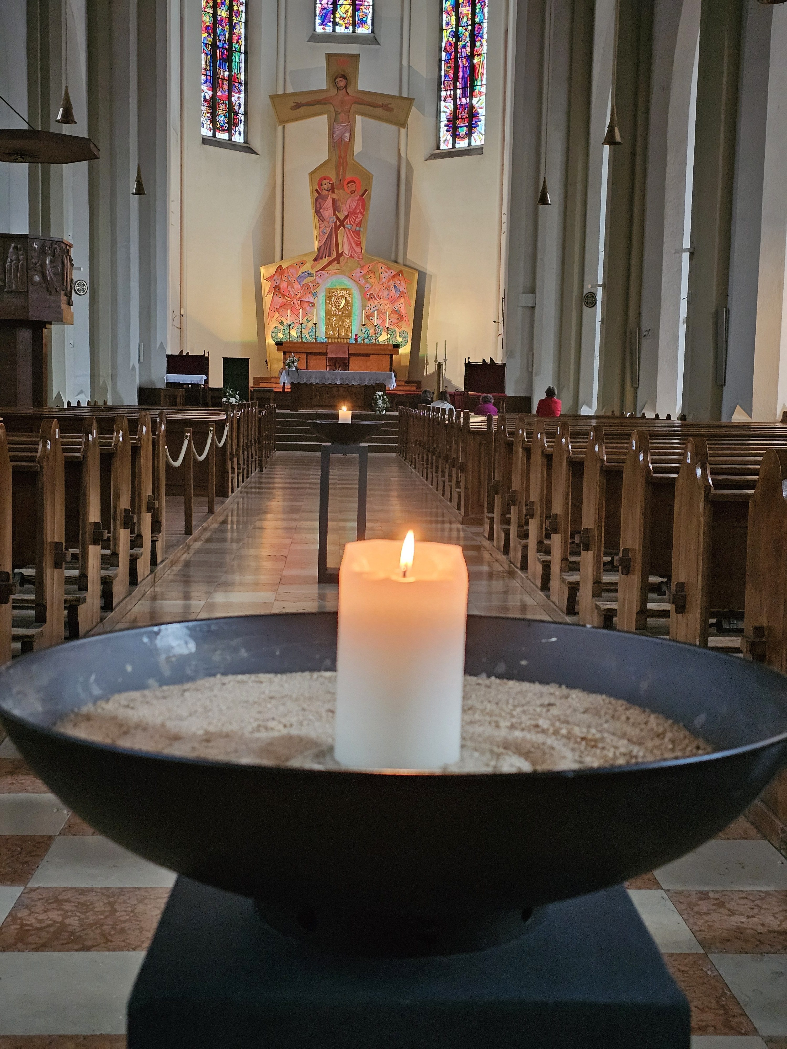 Alternative Text: The interior of Andräkirche (St. Andrä Church) in Salzburg, Austria. A lit candle in a bowl of sand is in the foreground, with rows of empty wooden pews leading to the altar in the background.