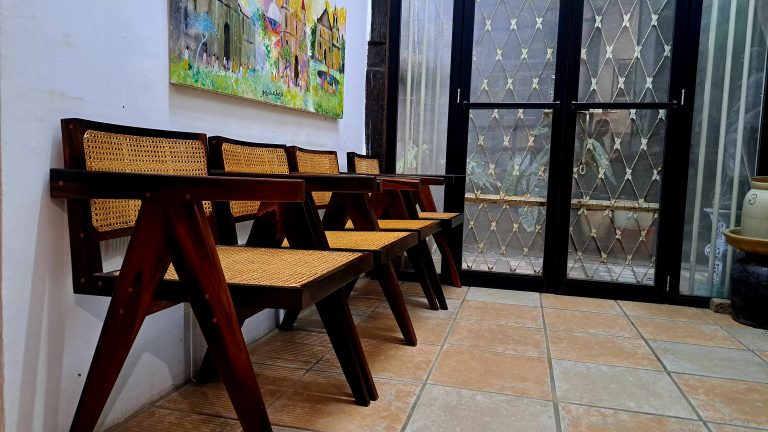 Alternative Text: A cozy corner featuring a row of four wooden chairs with cane seats arranged against a white wall.