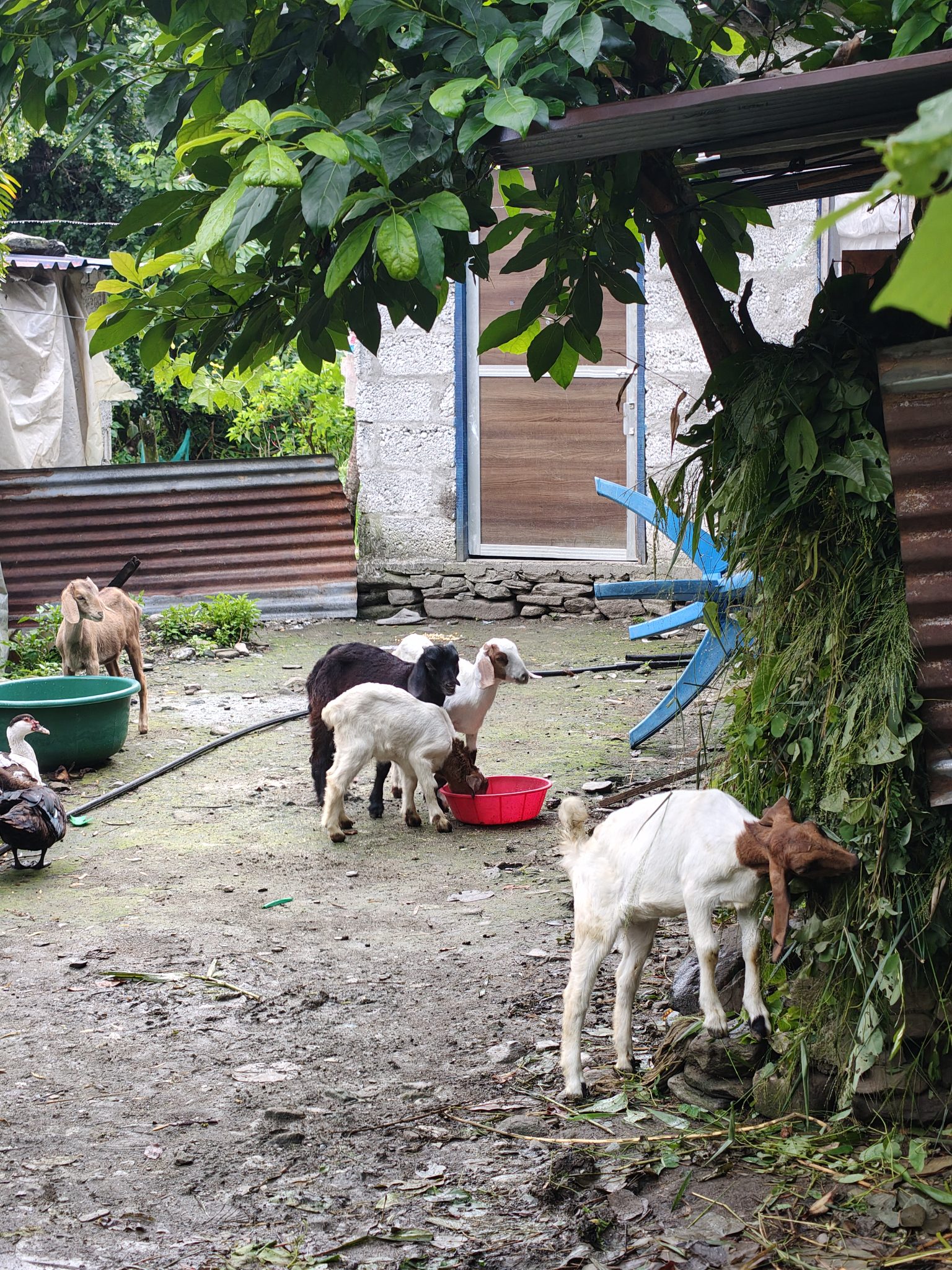 Alternative Text: A small farmyard scene with several goats and ducks.