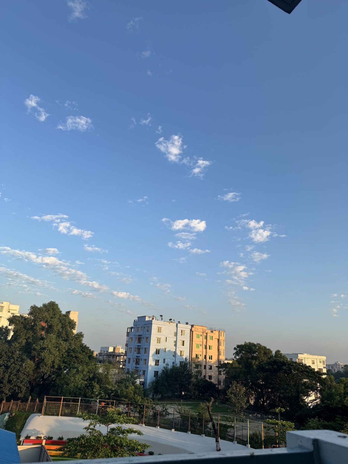 Alternative Text: A clear blue sky dotted with scattered white clouds, overlooking a residential area with several multi-story buildings, some painted in pastel colors.