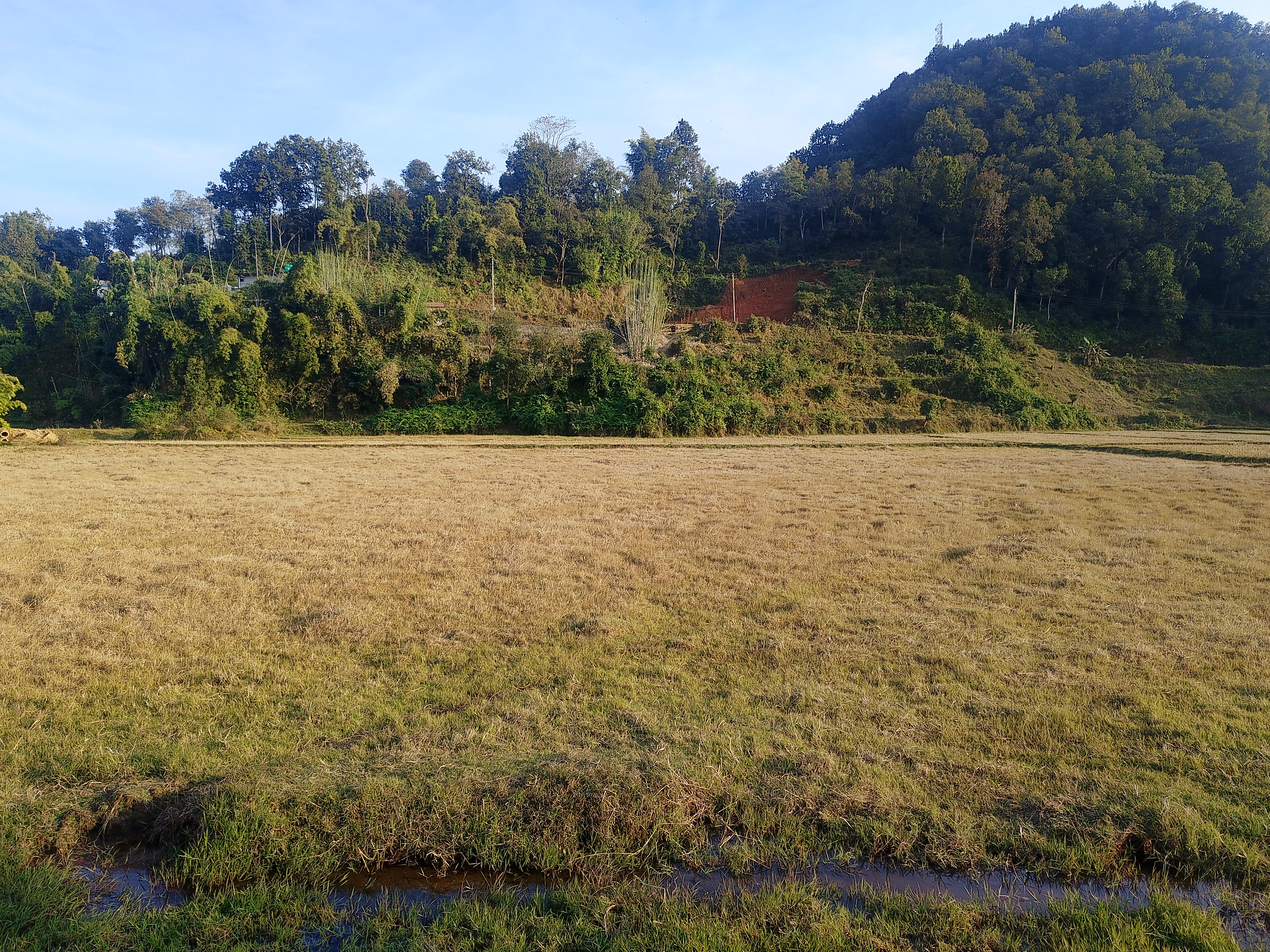 Alternative Text: A wide view of a lush landscape featuring a grassy field in the foreground and a hill covered with trees in the background.