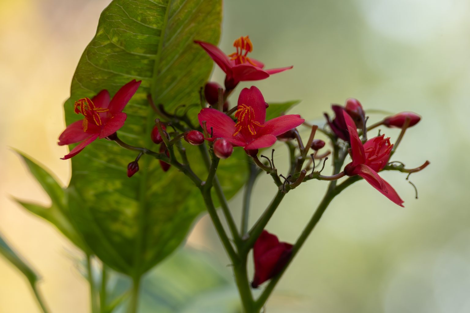 Alternative Text: A close-up of vibrant red flowers with yellow stamens, framed by green leaves against a softly blurred background.