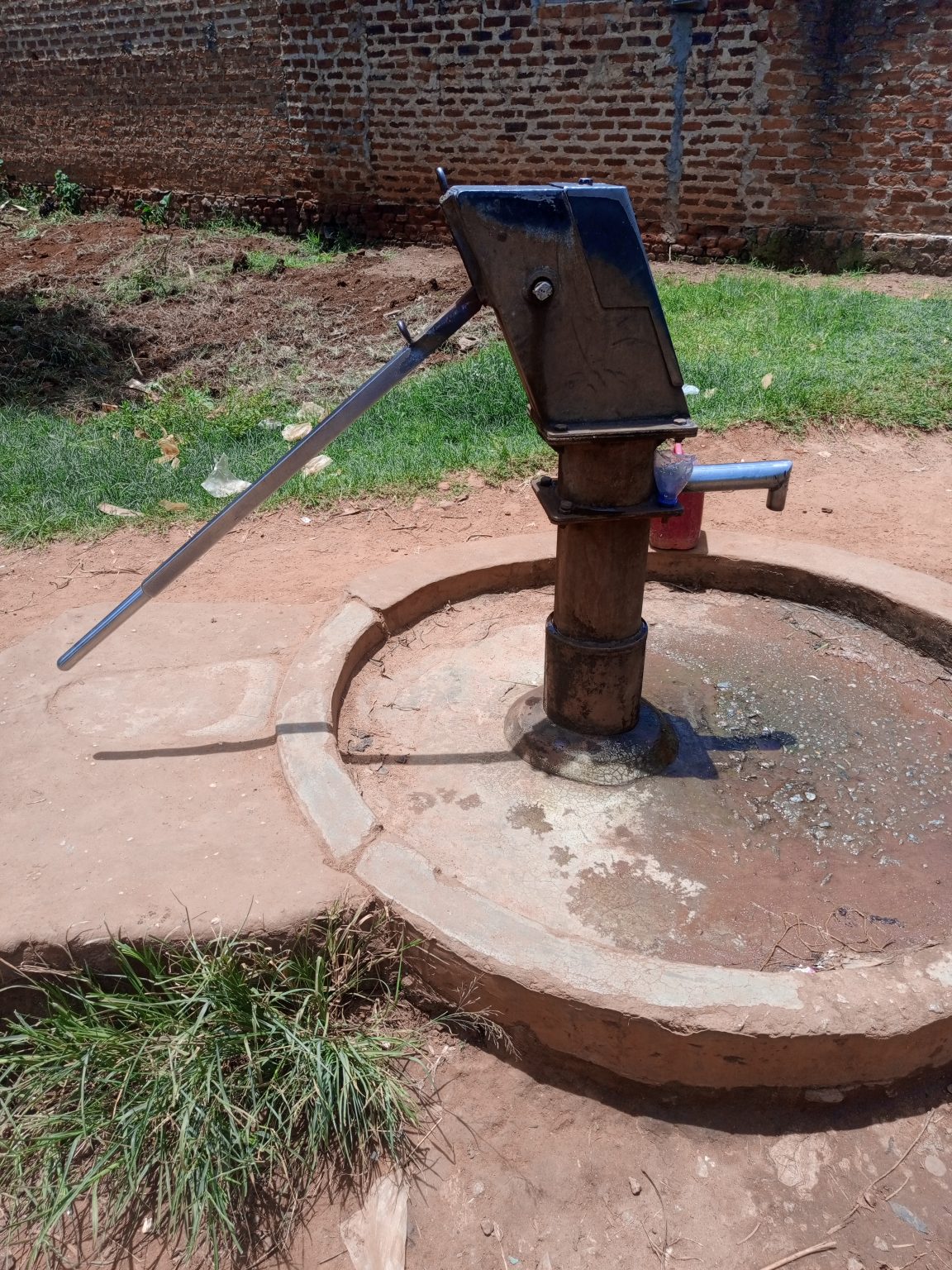 Alternative Text: A borehole in rural Uganda with a brick wall in the background.