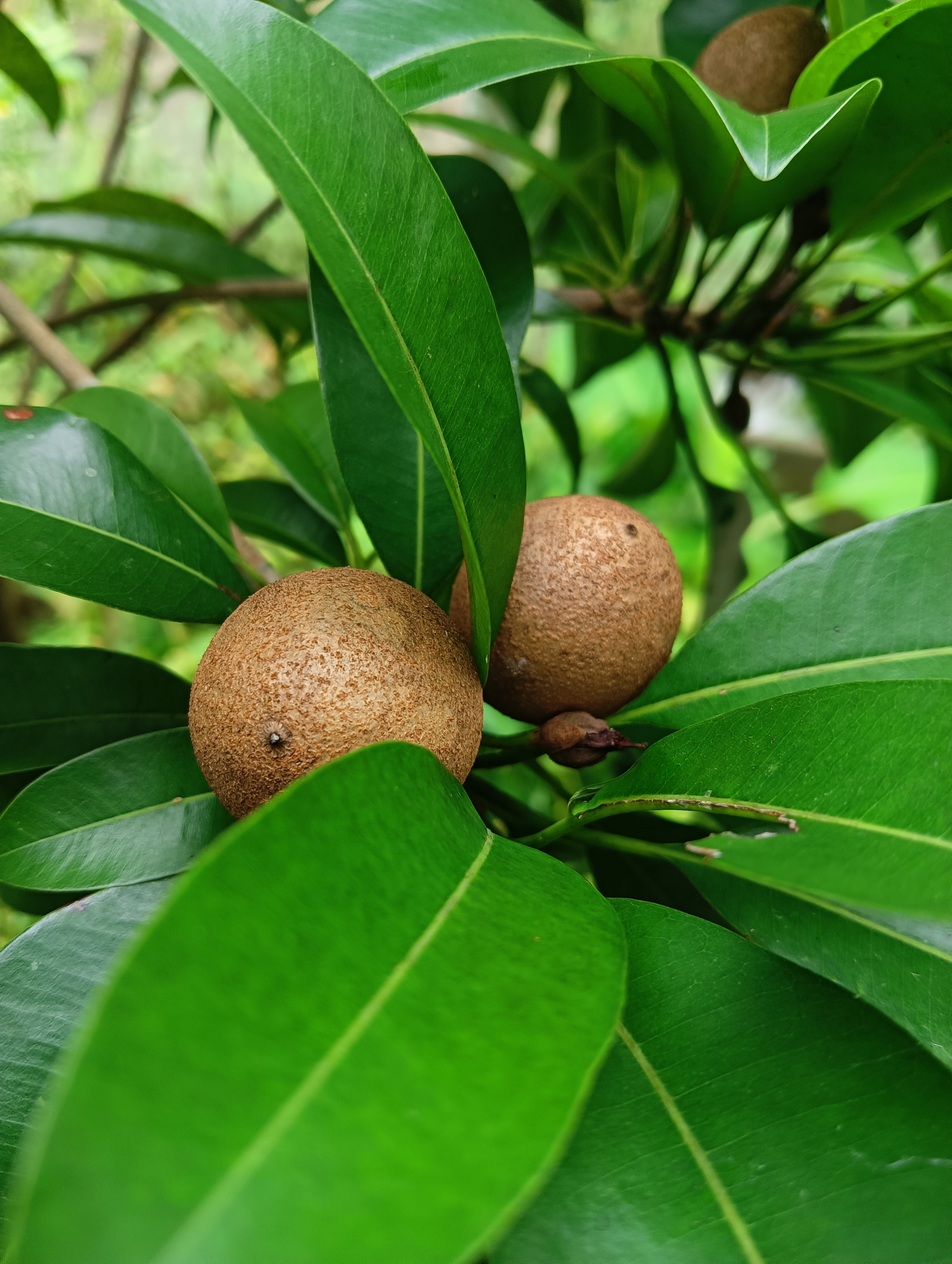 Alternative Text: Close-up of green leaves surrounding two round, brown fruits on a tree.