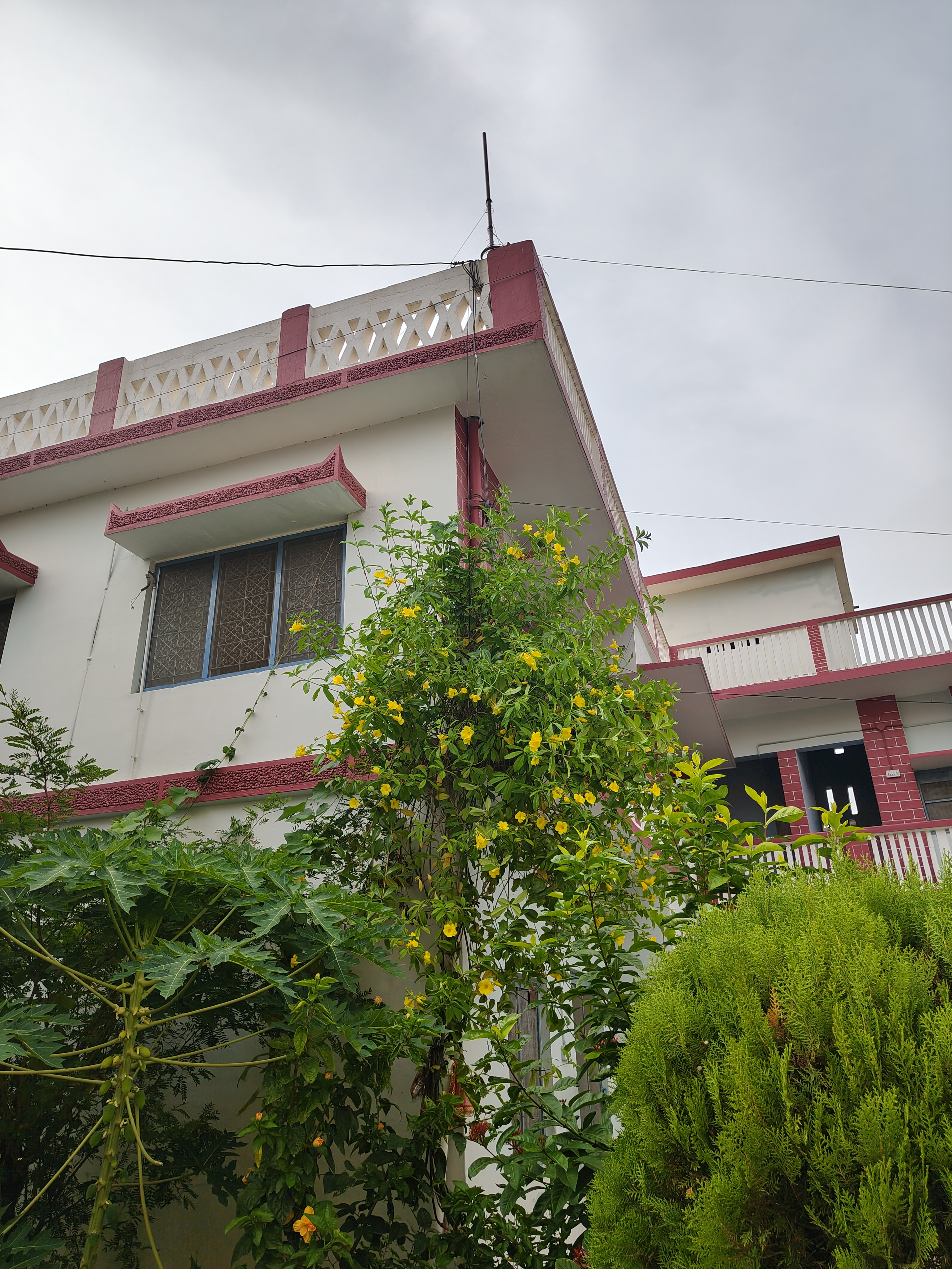 Alternative Text: A multi-story building with a white facade and red decorative accents is shown from an angle