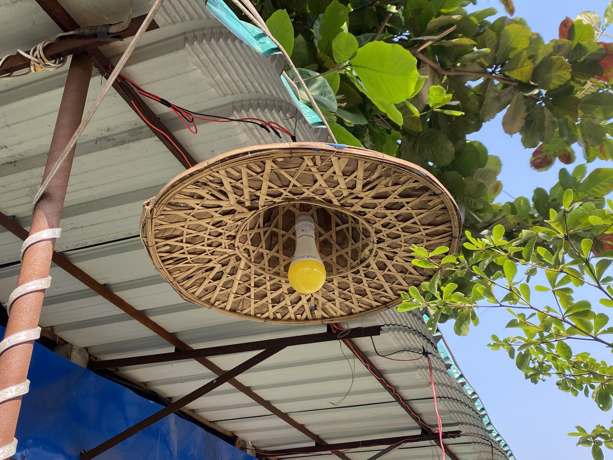 Alternative Text: A woven straw lamp shade hangs from a metal framework, shielding a light bulb that emits a soft yellow light. In the background, green leaves from nearby trees and a bright blue sky are visible.