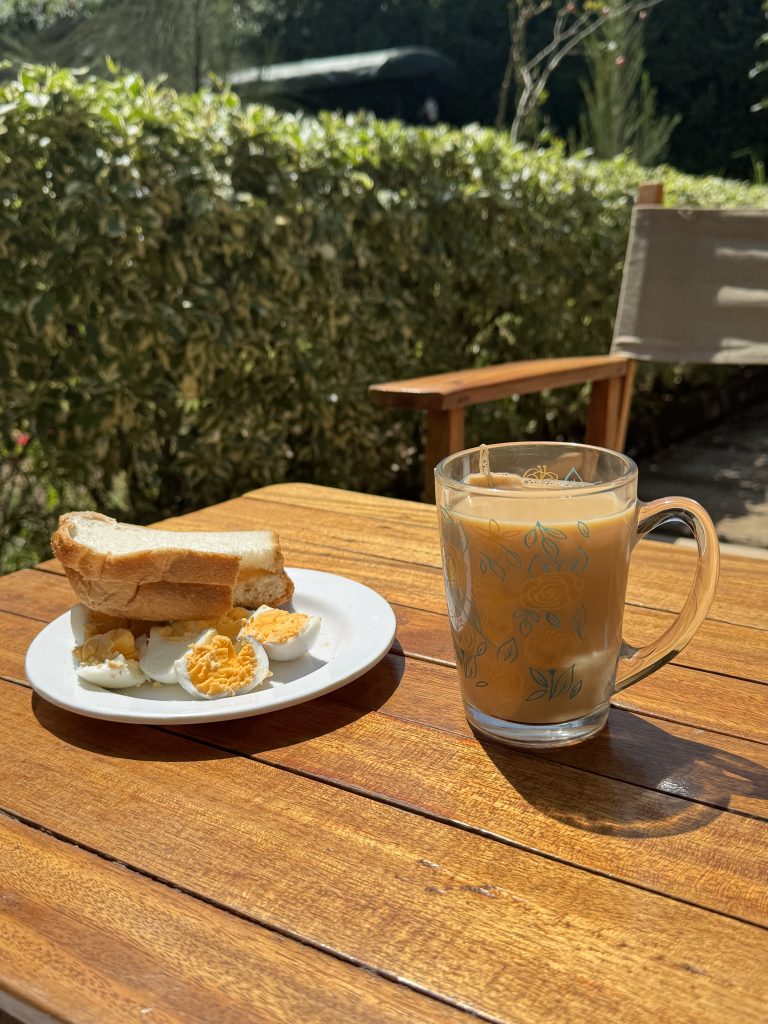 Alternative Text: A wooden table outdoors displays a plate with sliced hard-boiled eggs and two slices of white bread. Beside the plate, a clear glass mug holds a warm cup of tea