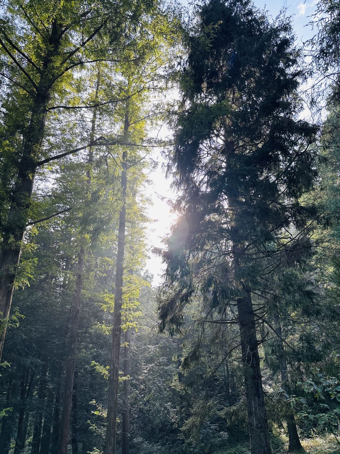 Alternative Text: A serene forest scene featuring tall trees with dense green foliage. Sunlight filters through the canopy, creating a soft glow that highlights the texture of the leaves and the bark of the trees