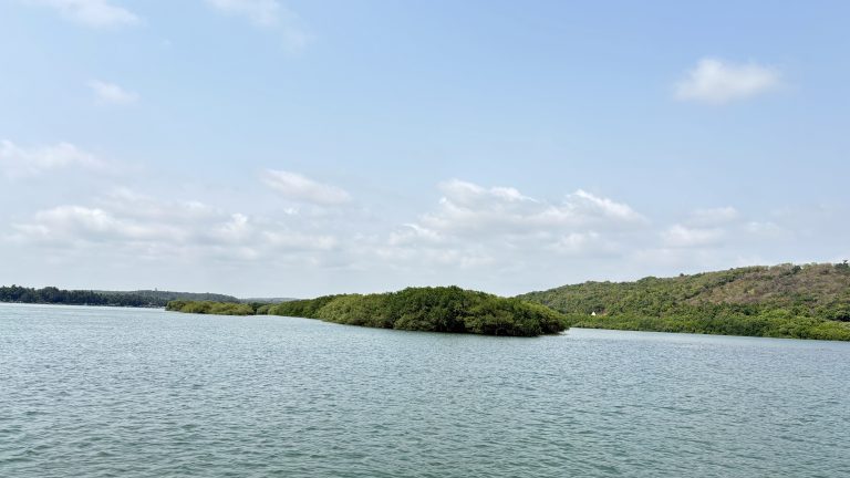 Alternative Text: A scenic view of a calm water body with a small, lush green island and surrounding forested hills under a bright blue sky with scattered clouds.