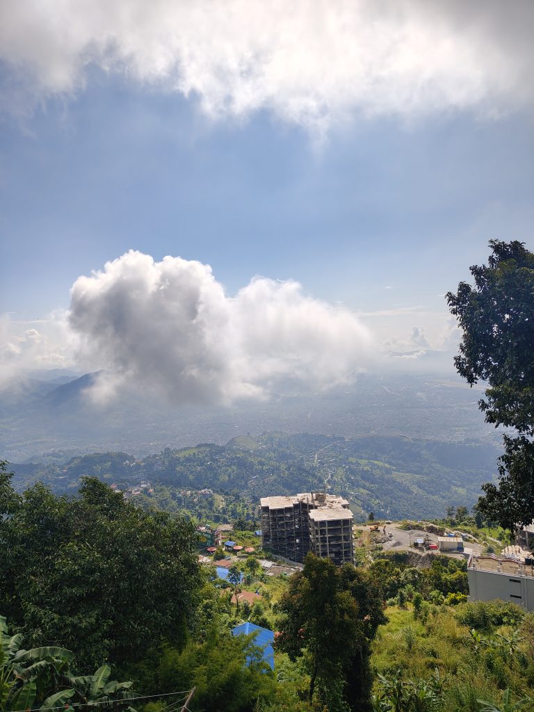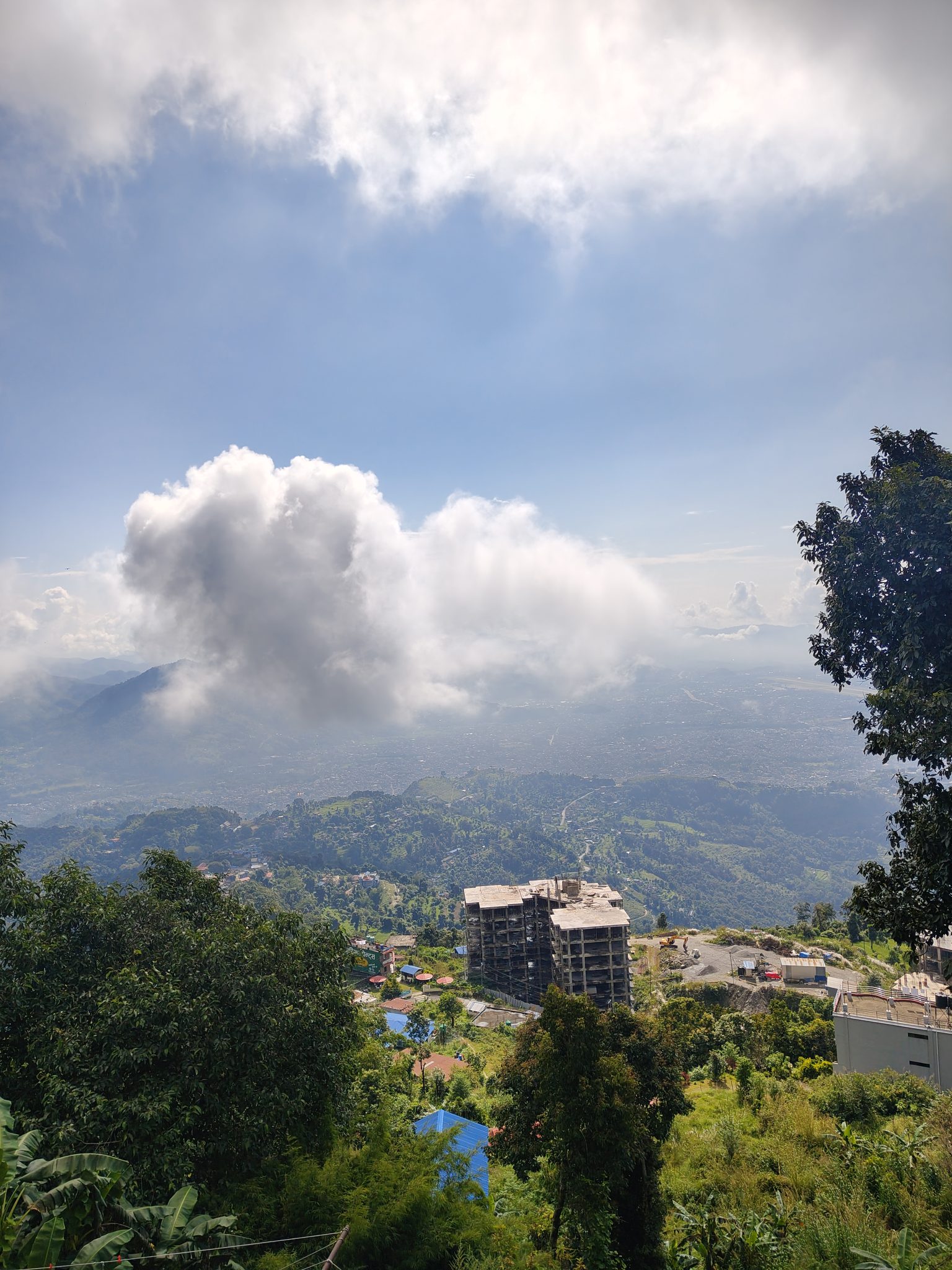 Alternative Text: A hillside view with lush greenery and trees in the foreground, overlooking houses with blue roofs and a partially constructed building below.