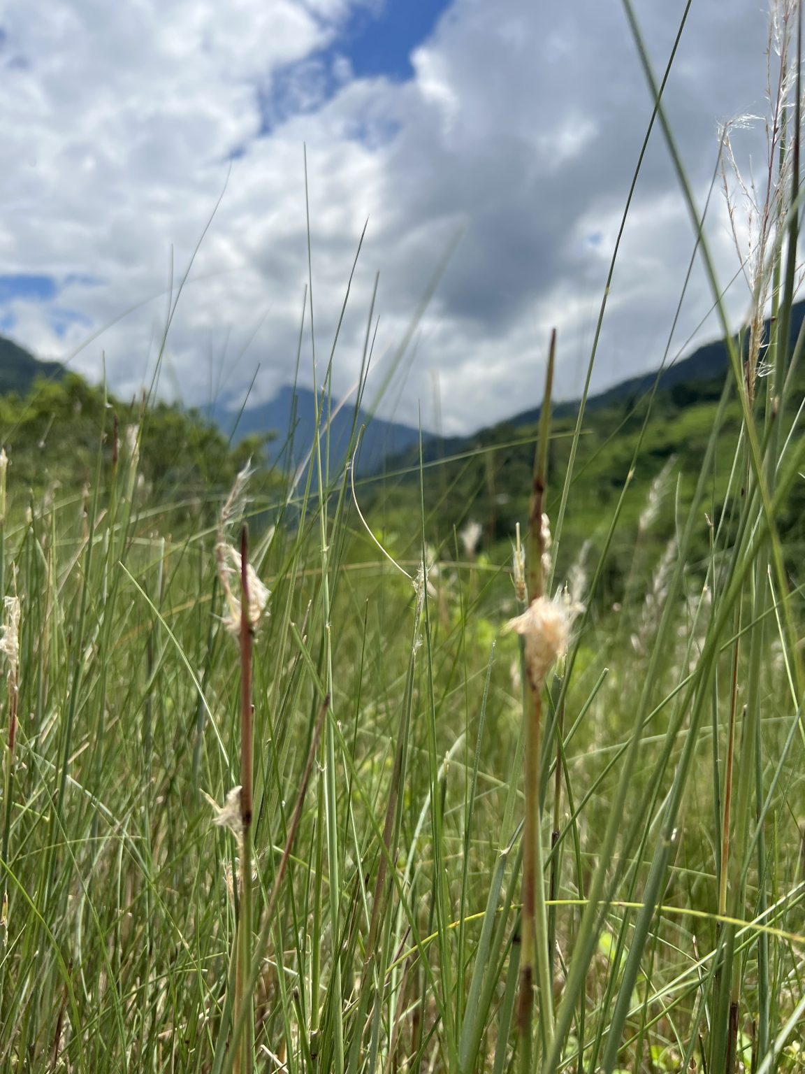 Alternative Text: A close-up view of tall grasses in a natural landscape, with a backdrop of mountains under a partly cloudy blue sky.