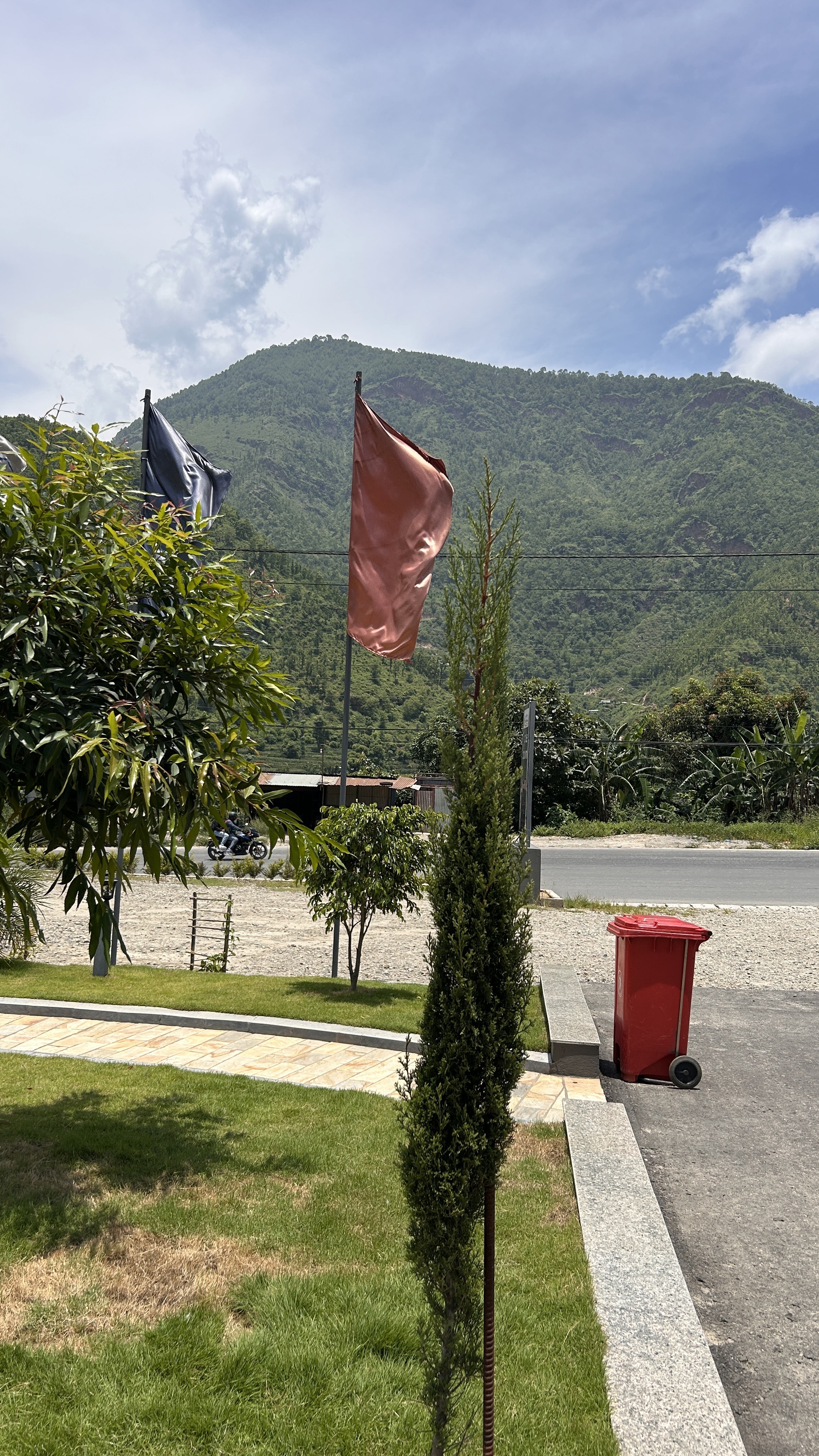 Alternative Text: The image shows two flags of different colours, fluttering in the breeze against a backdrop of lush green mountains under a partly cloudy sky.