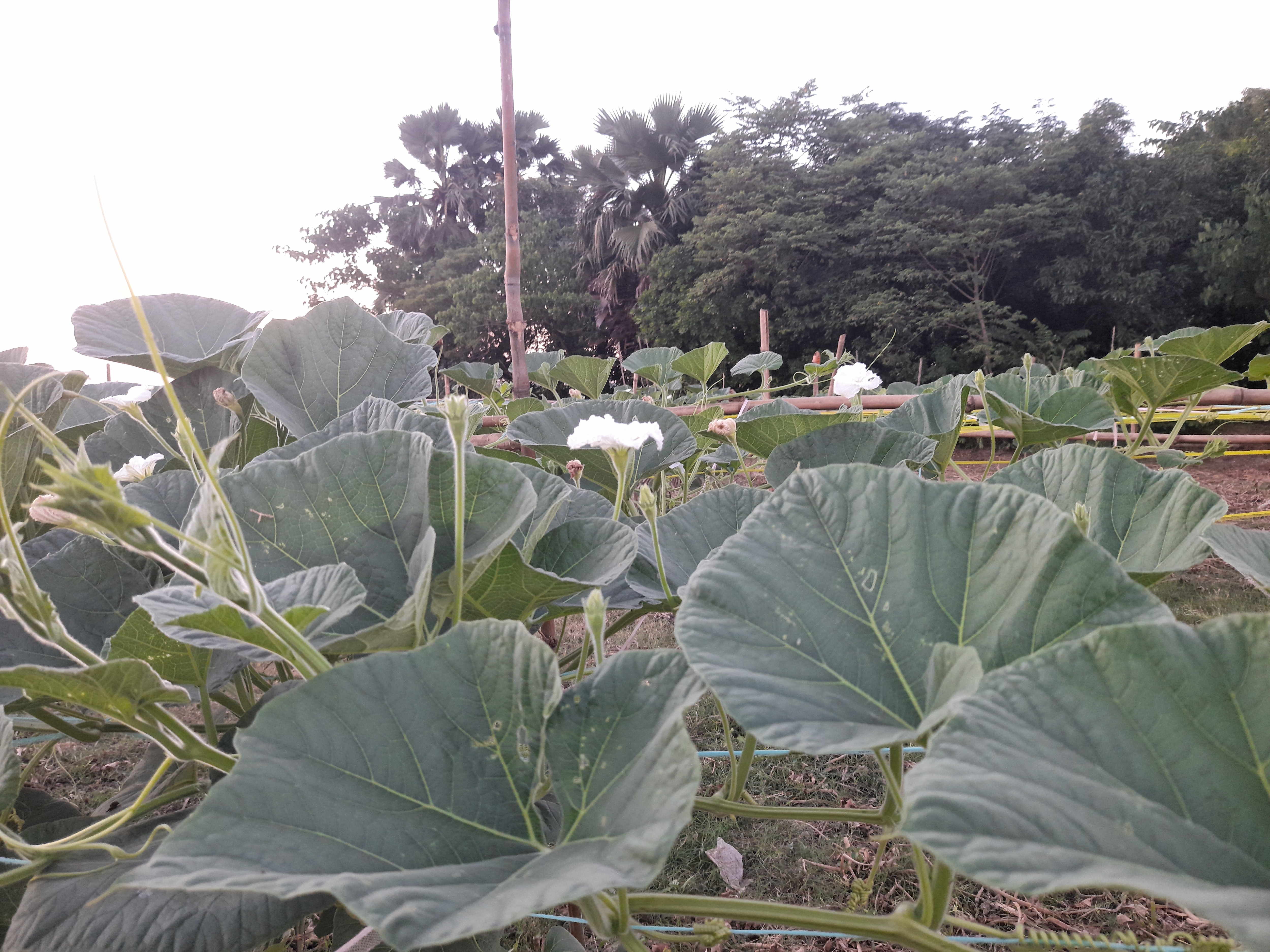 Alternative Text: A lush green field of large-leaved plants with several white flowers blooming among the foliage.