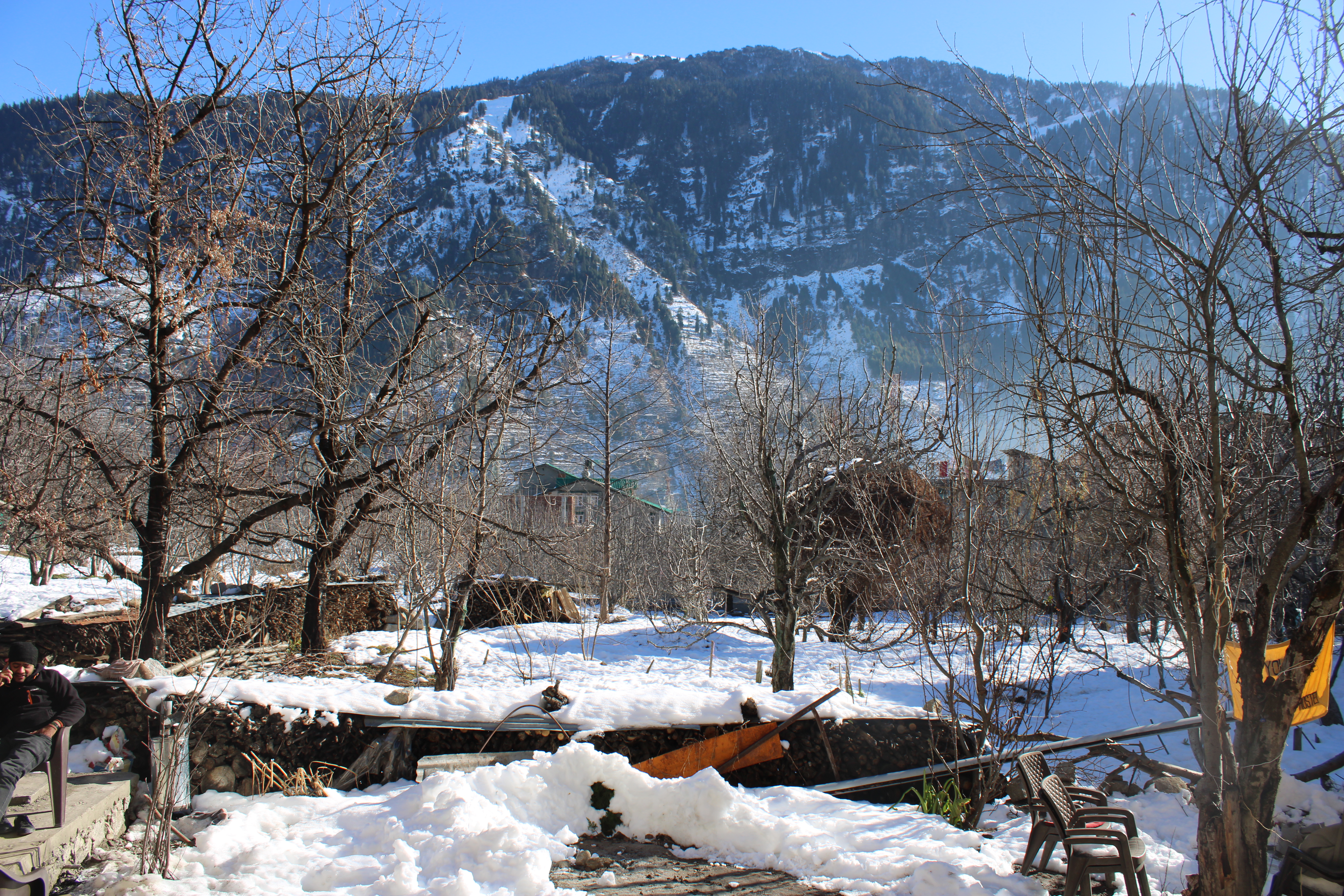 Alternative Text: High altitude: A view of a snowy ground with a house and a mountain in the background.