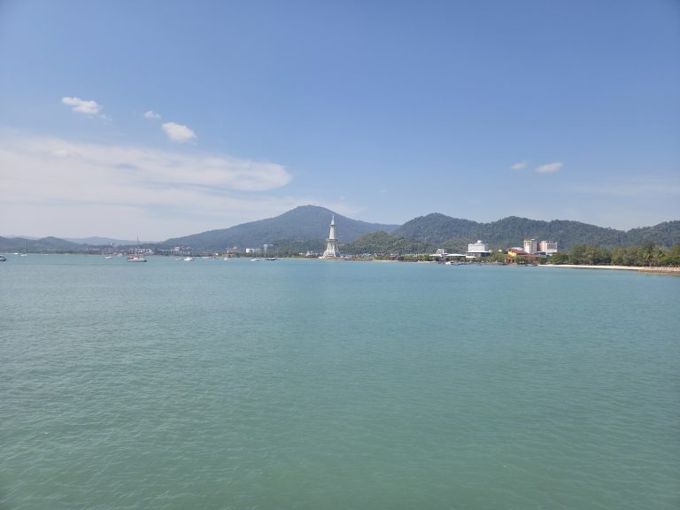 Alternative Text: A calm blue bay with small boats, green hills in the background, and a tall white lighthouse near the shore surrounded by buildings and greenery.