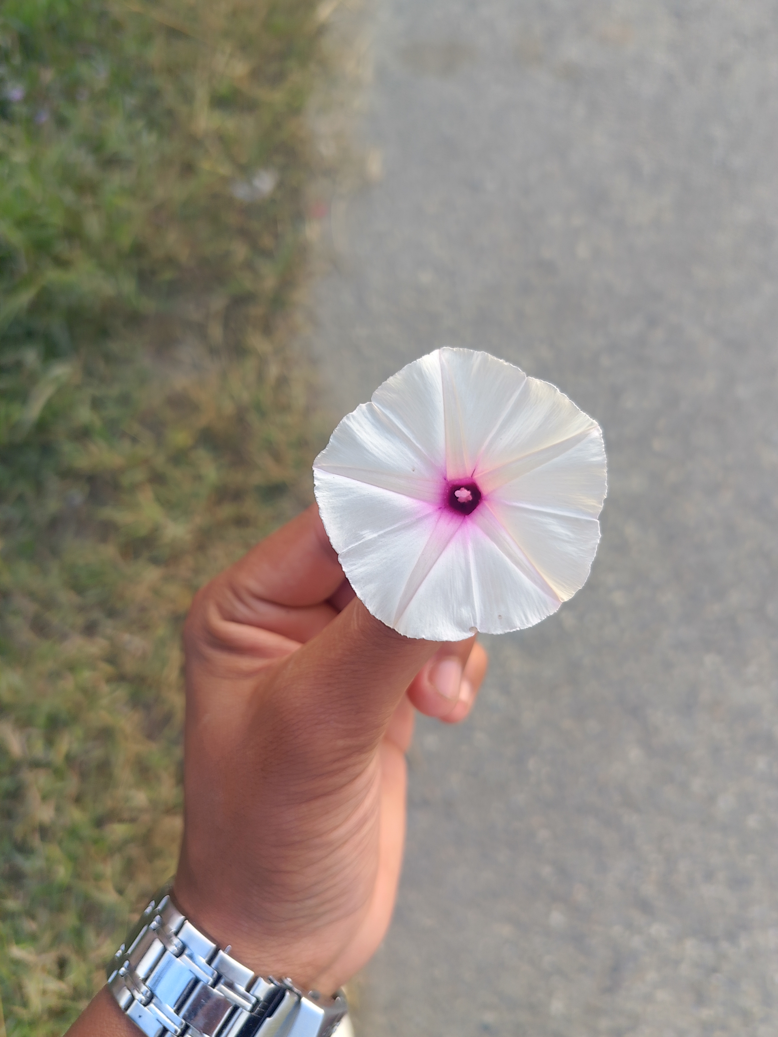 Alternative Text: A close-up view of a white flower held by a hand, displaying delicate petals with a hint of pink at the center. The background features green grass and a gravel pathway. The hand is adorned with a silver wristwatch.