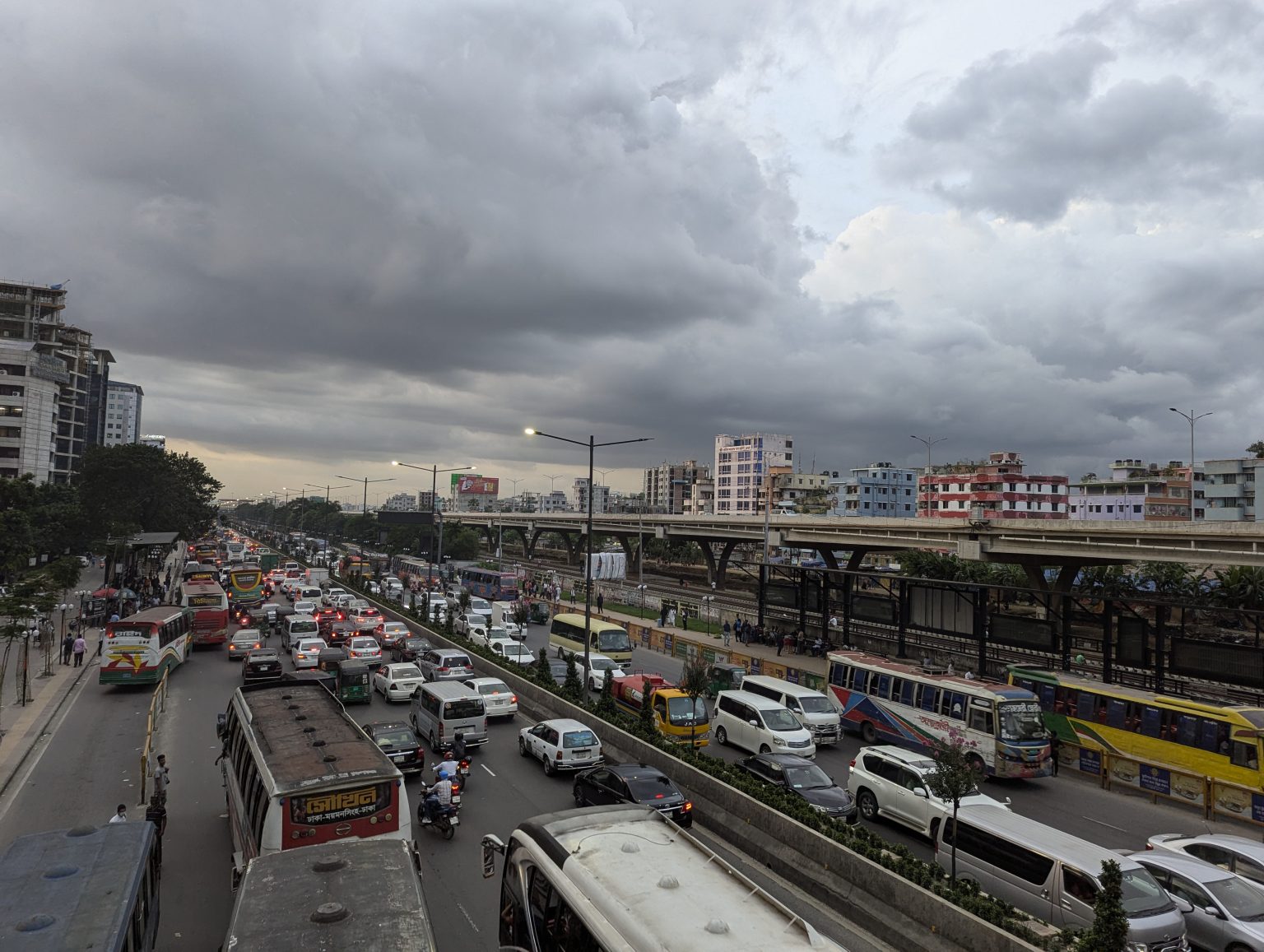 Alternative Text: A very busy road in an Asian city, with numerous vehicles and an elevated railway. Several building can be seen in the background. Dark clouds cover the sky.