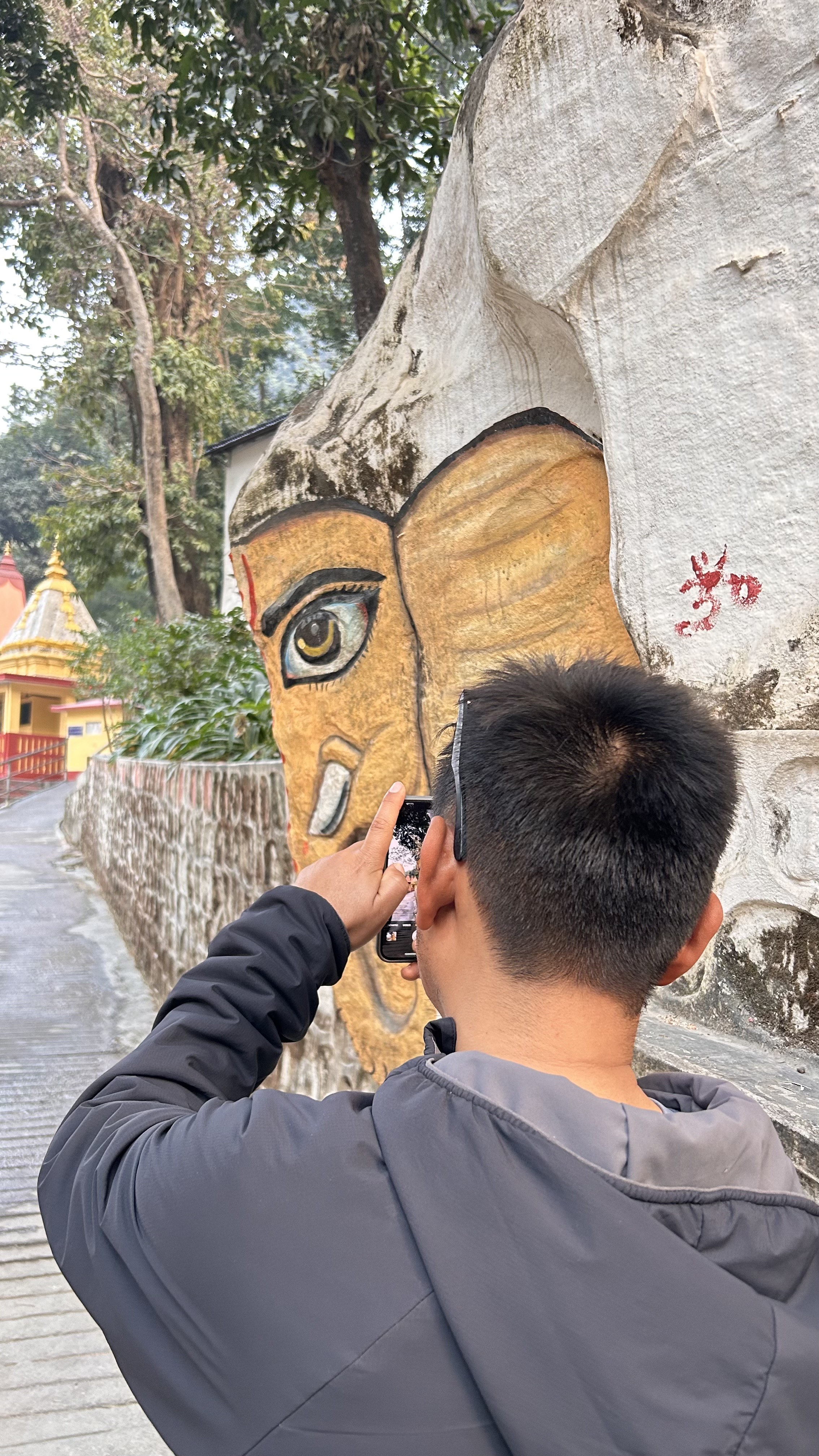 Alternative Text: A person is standing on a pathway, facing a large rock wall that features a painted face. The face is stylized with prominent features, including a large eye and a slight smile, in warm yellow and orange tones.
