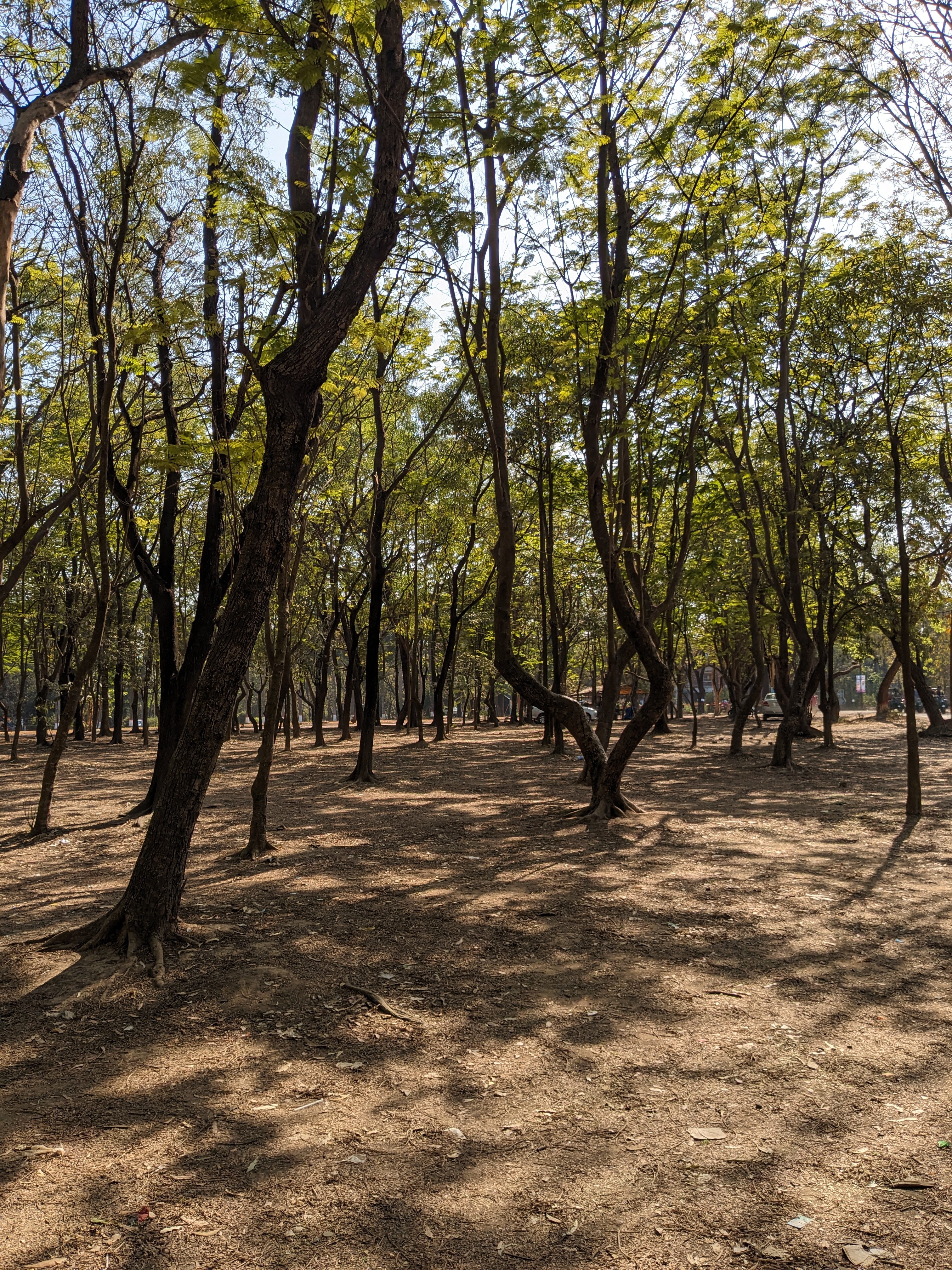 Alternative Text: A sunlit forest with tall, thin trees casting long shadows on dry, brown soil. The trees have light green leaves, and sunlight filters through the branches, creating a dappled pattern on the ground. The scene feels calm and natural, suggesting a quiet wooded park or grove.