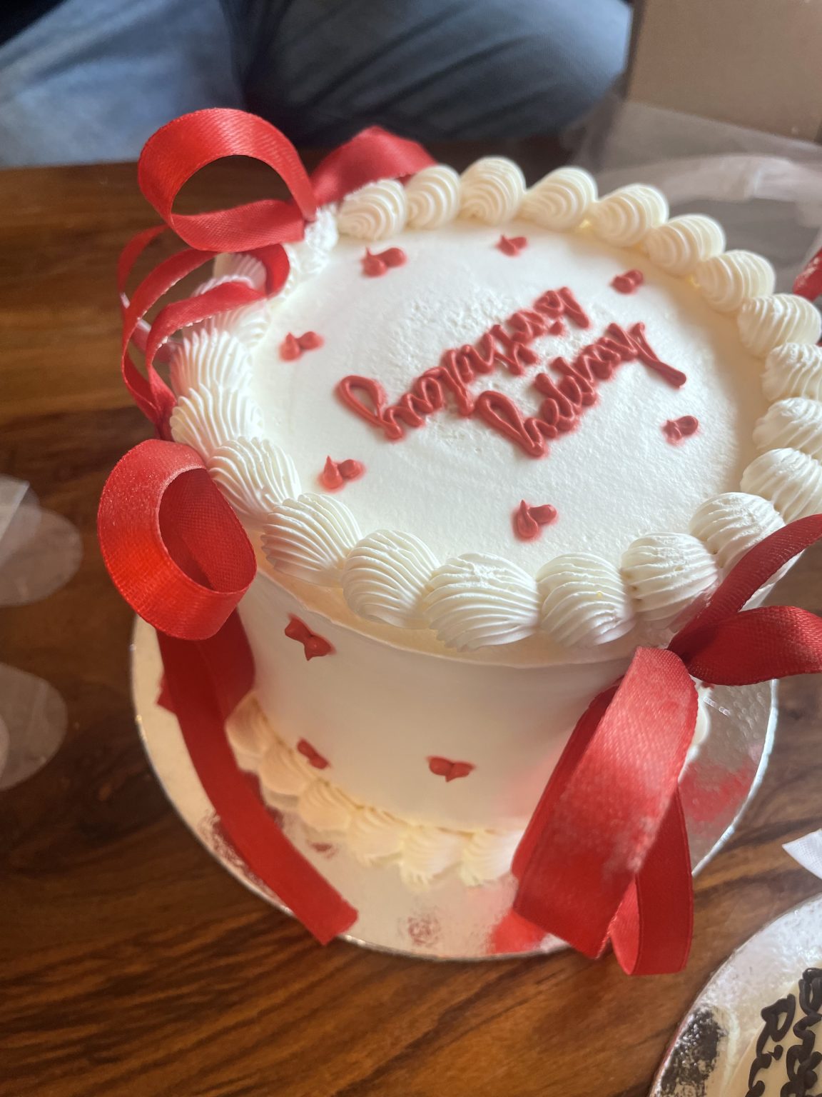 Alternative Text: A round white cake topped with a decorative border of whipped cream and red ribbon accents. The cake is adorned with small red heart-shaped decorations and features the phrase “happy birthday” written in red icing on the top.