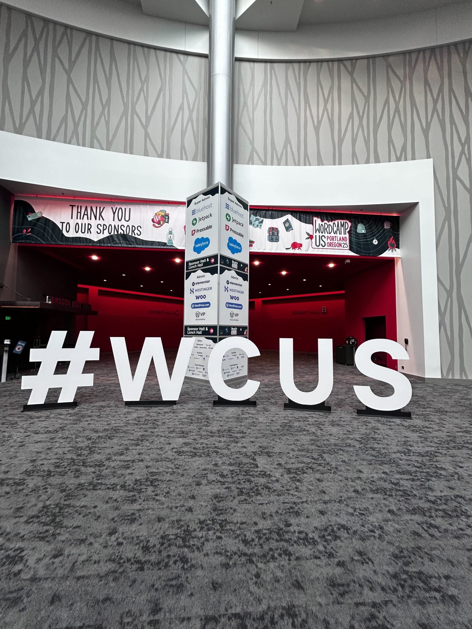 Alternative Text: Large event logo in front of a sponsor pole, WordPress US welcome hall.