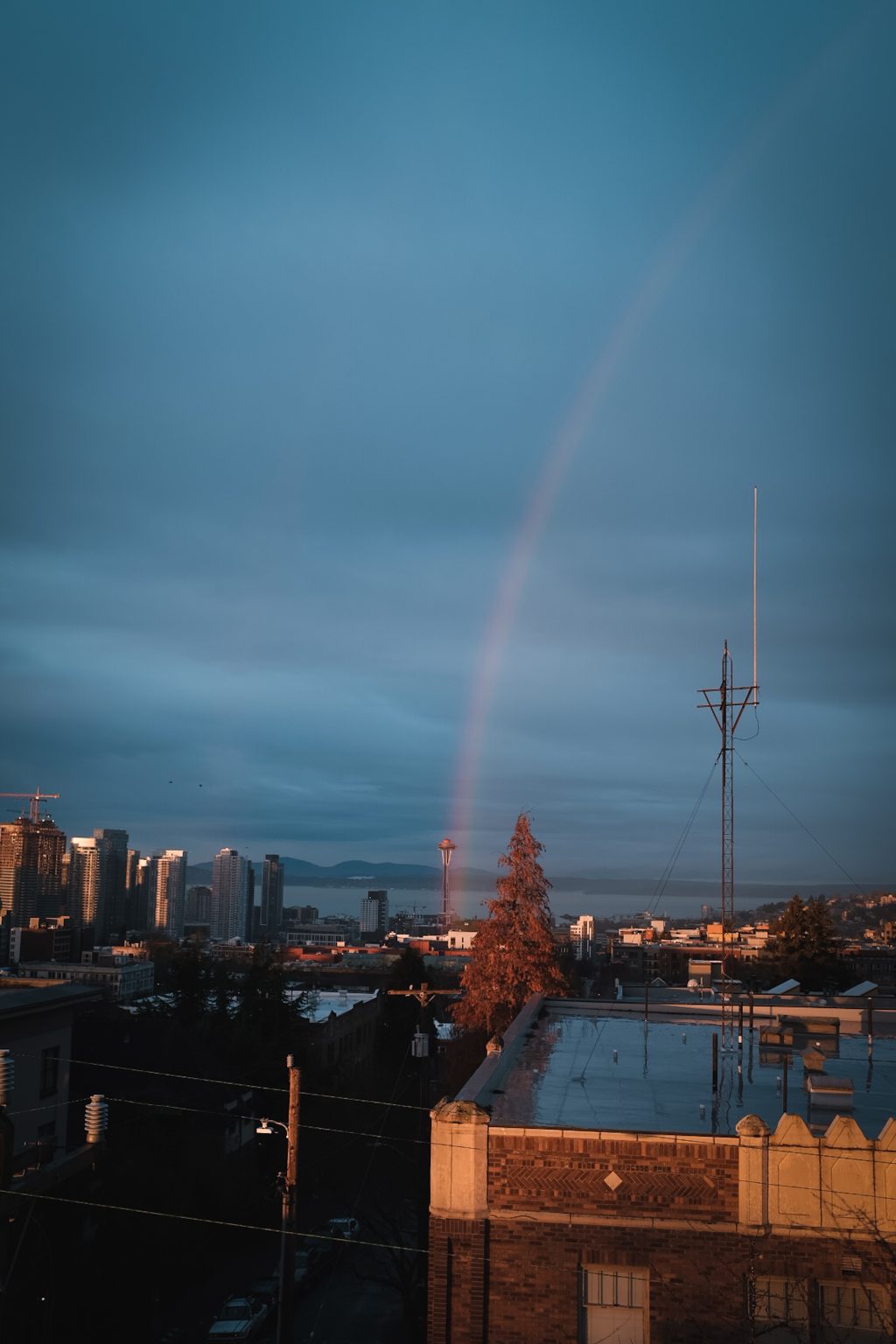 Alternative Text: Zoomed out view of a rainbow hitting the Seattle space needle against a moody, rainy day