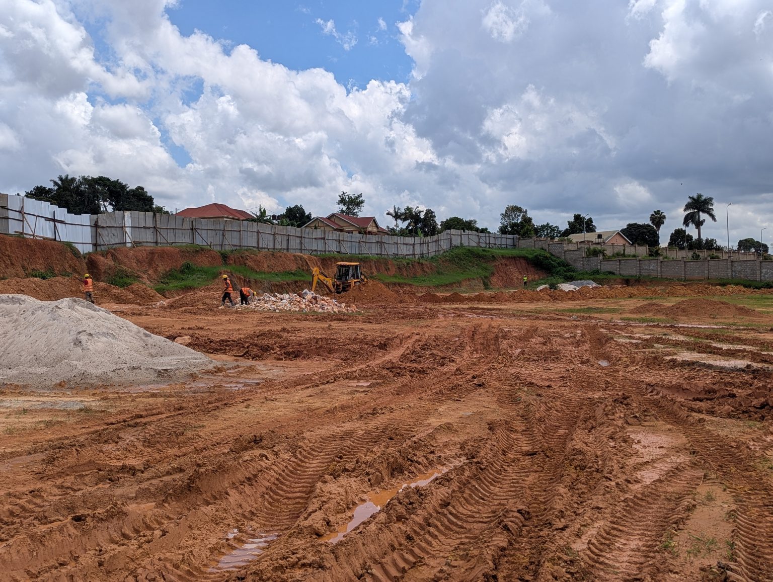 Alternative Text: A construction site with a large, cleared dirt area under a partly cloudy sky. Several workers in orange vests are scattered across the site, engaging in various activities, including operating machinery.