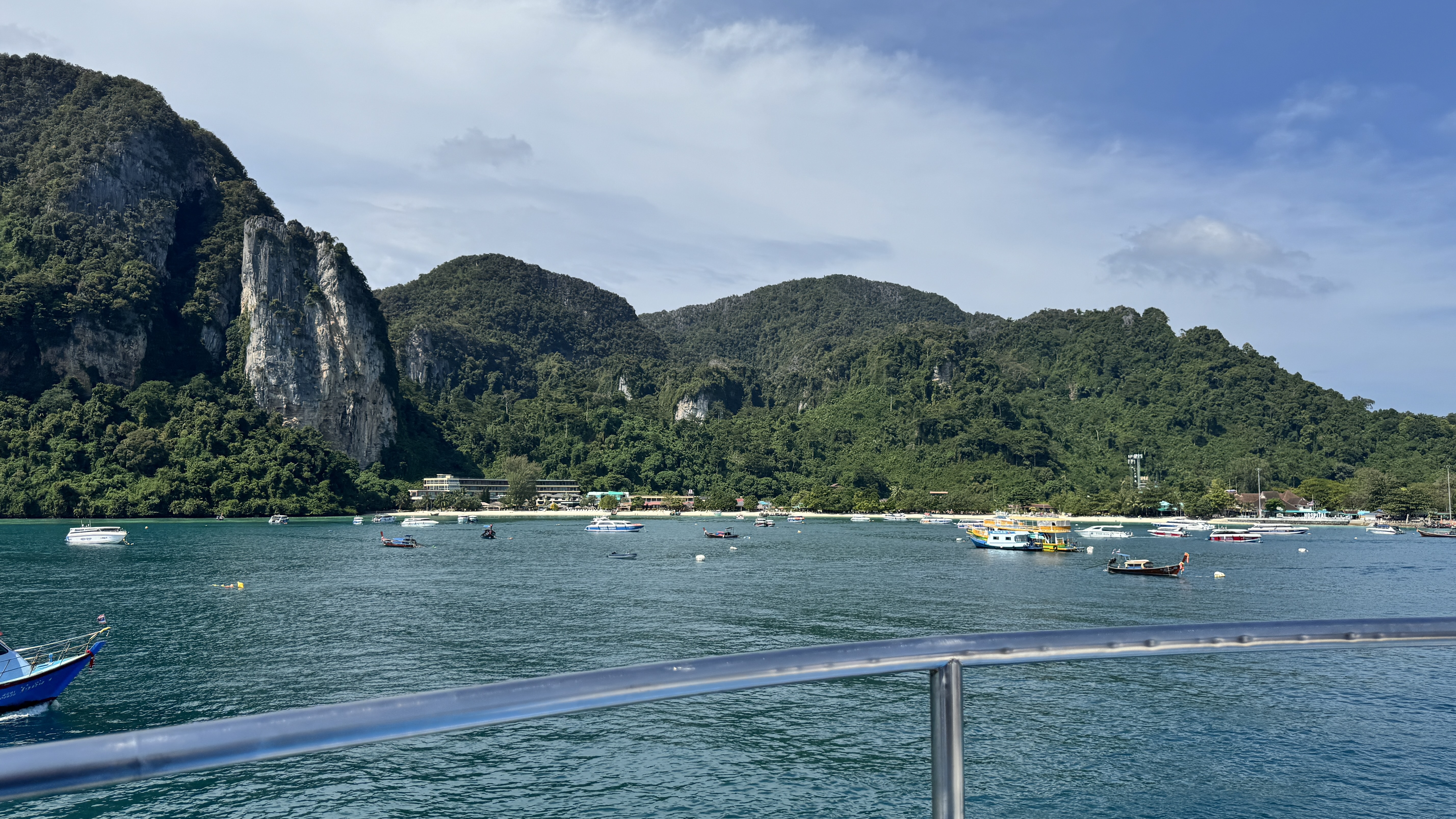 Alternative Text: A panoramic view from a boat of a lush tropical bay with numerous speedboats and ferries anchored near a sandy beach and forested mountains.