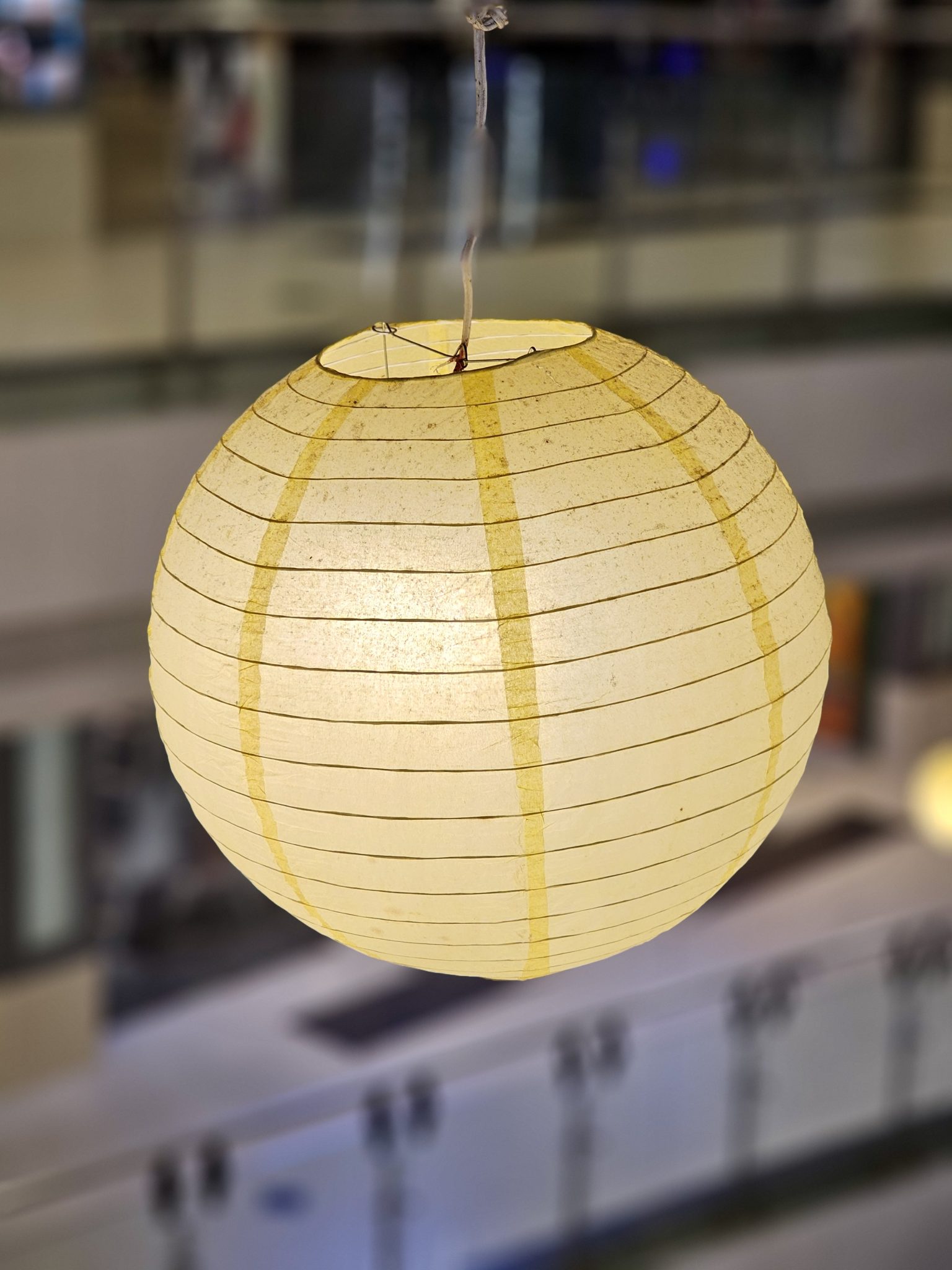 Alternative Text: A warm-toned paper lantern with vertical yellow lines hanging from the ceiling of a shopping mall in Kozhikode, Kerala. The soft glow and bokeh background add a calming aesthetic.