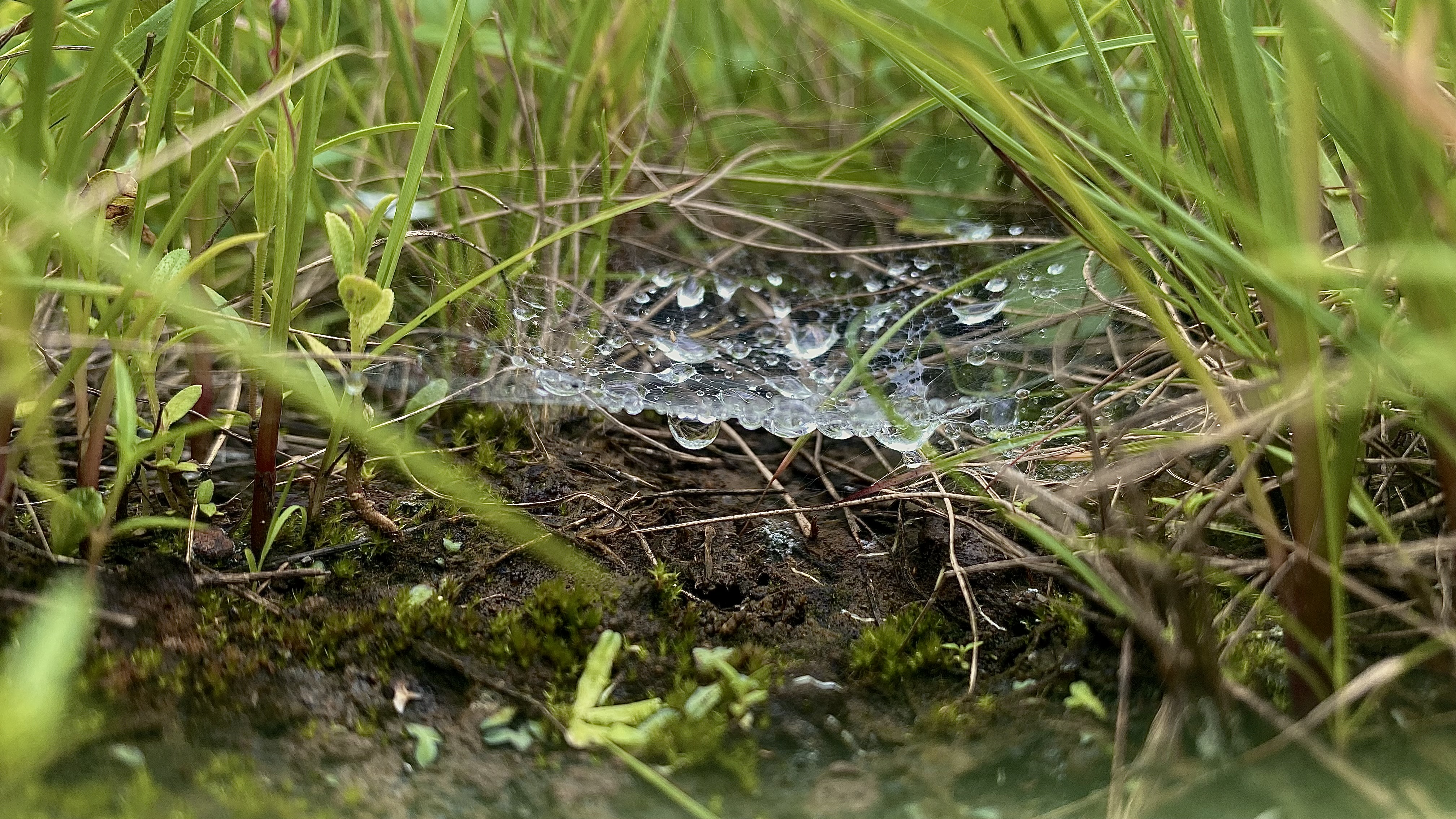 Alternative Text: Close-up of a spiderweb with glistening droplets stretched over vibrant green grass, creating a serene natural scene.