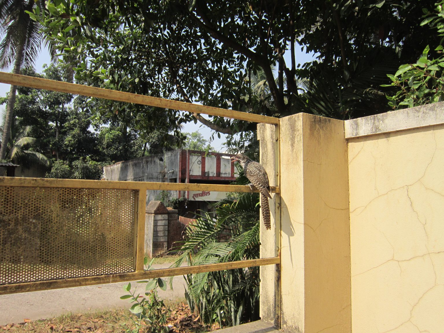 Alternative Text: A Asian Koel bird perched on a yellow gate, with a backdrop of lush green trees and a partially visible building in the background.