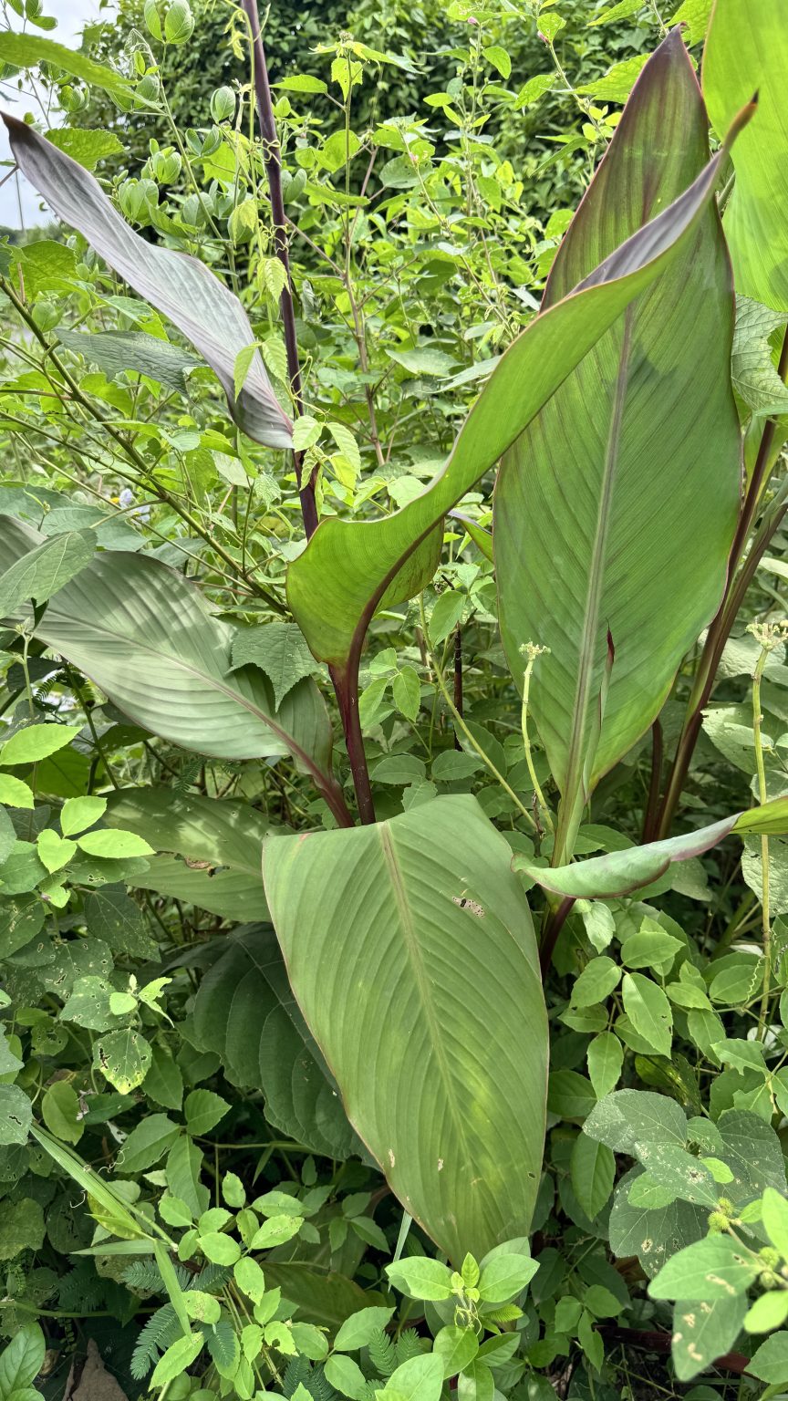 Alternative Text: A canna lily plant with large, paddle-like green leaves and reddish stems stands out among a patch of wild undergrowth.