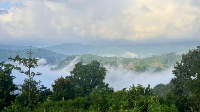 Alternative Text: Peaceful view of green hills and dense forest in Bandarban under a dramatic cloudy sky, showcasing the natural beauty of the mountain landscape.