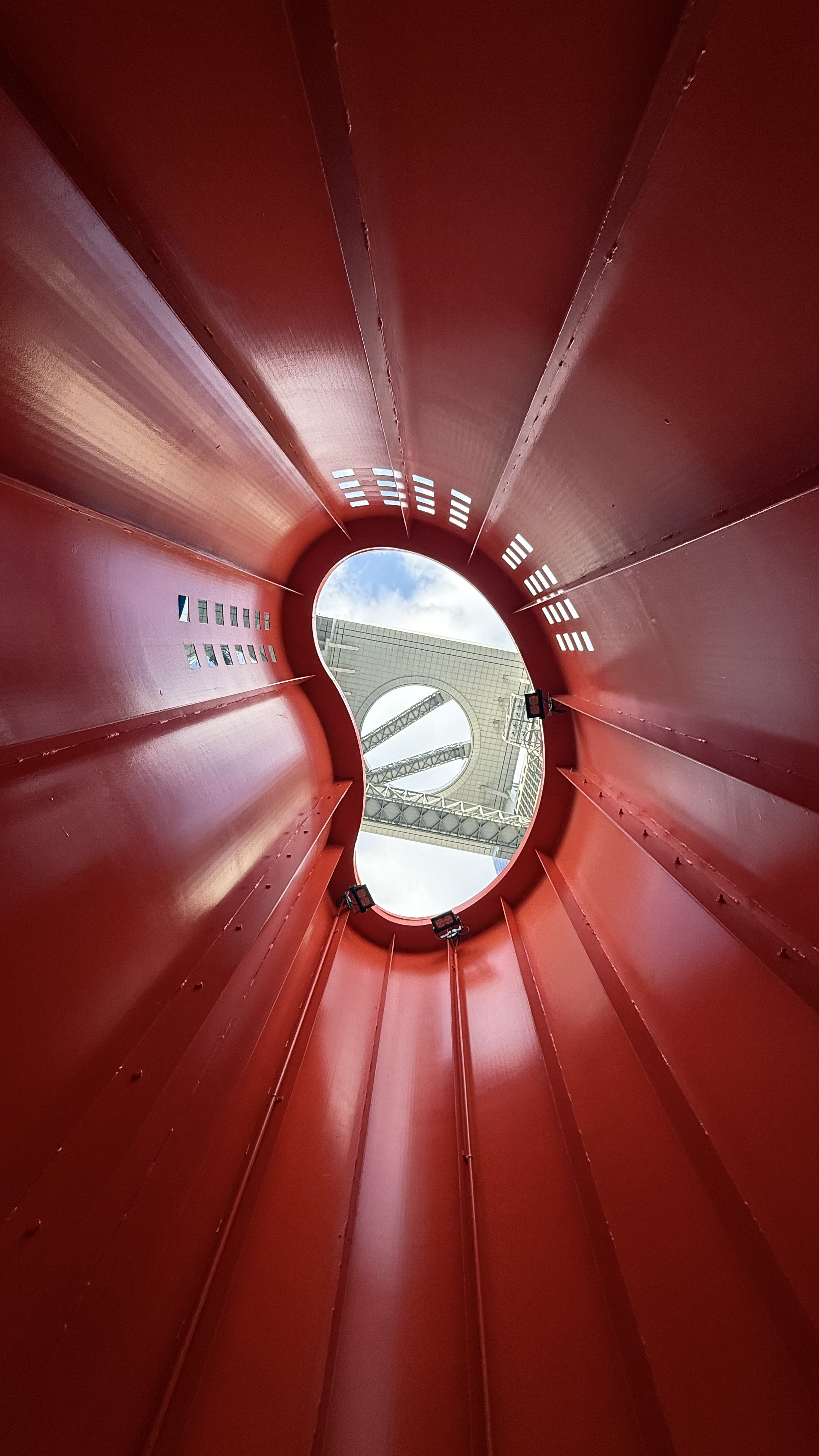 Alternative Text: The photo looks up at the Umeda Sky Building in Osaka, Japan, through the red sculpture in front of it.