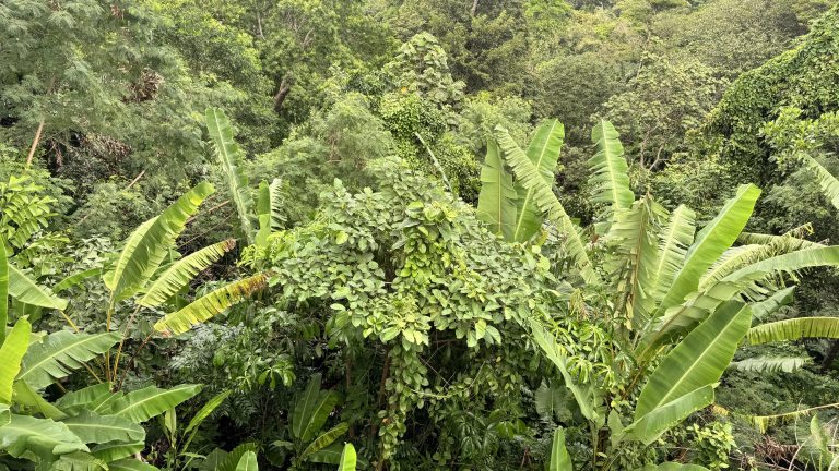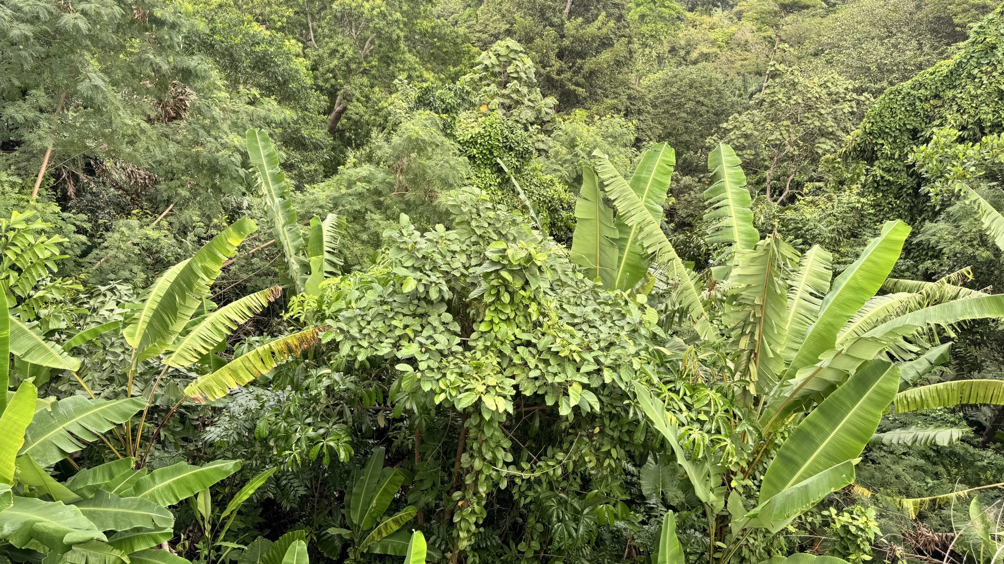 Alternative Text: A dense tropical landscape filled with various shades of green foliage. The scene features large banana leaves and a multitude of smaller plants, creating a rich and lush appearance.