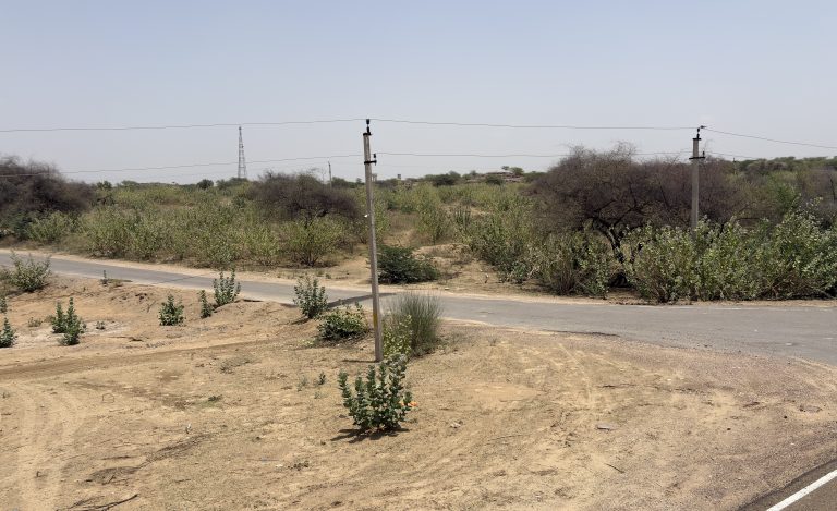 Alternative Text: A rural landscape featuring a paved road with a sandy shoulder, surrounded by sparse vegetation and small bushes. Utility poles with power lines stretch along the road, and in the background, there are more shrubs, trees, and a distant communication tower under a clear blue sky.
