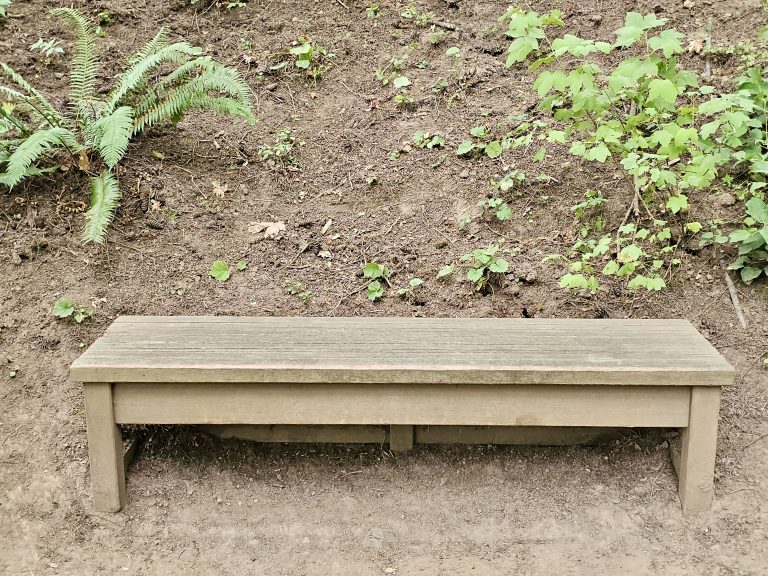 Alternative Text: A simple wooden bench is placed on soil along a garden trail at the Portland Japanese Garden. Surrounded by ferns and small plants, it offers a quiet resting spot.
