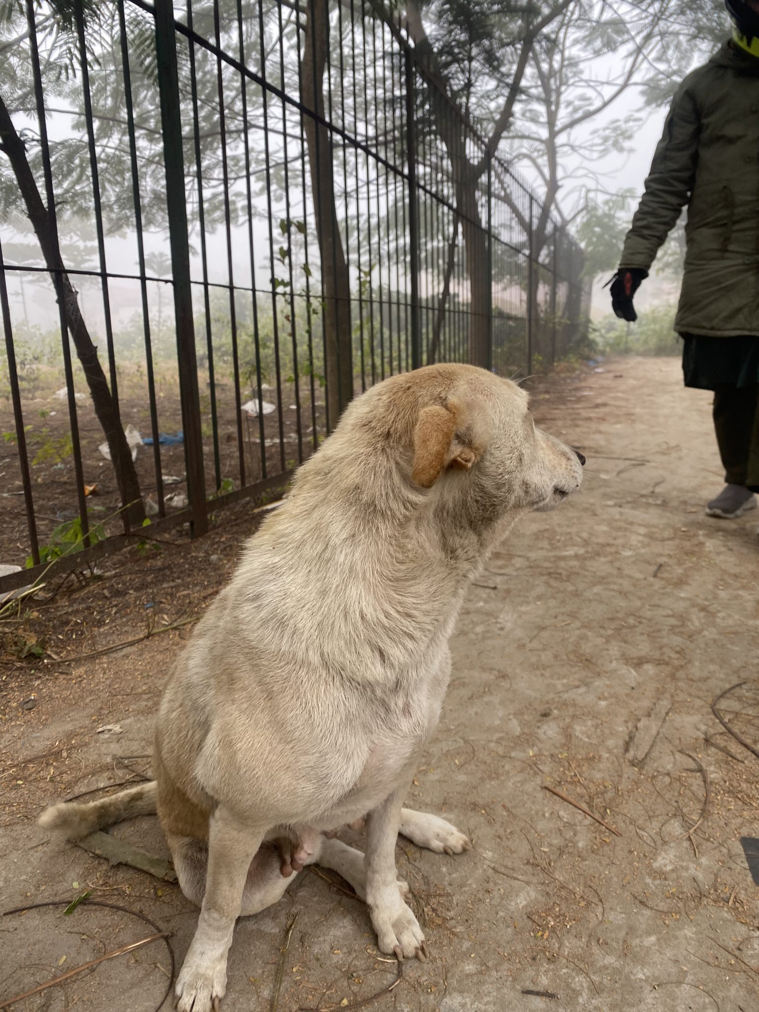 Alternative Text: A light-colored dog is sitting on a dirt path near a metal fence.