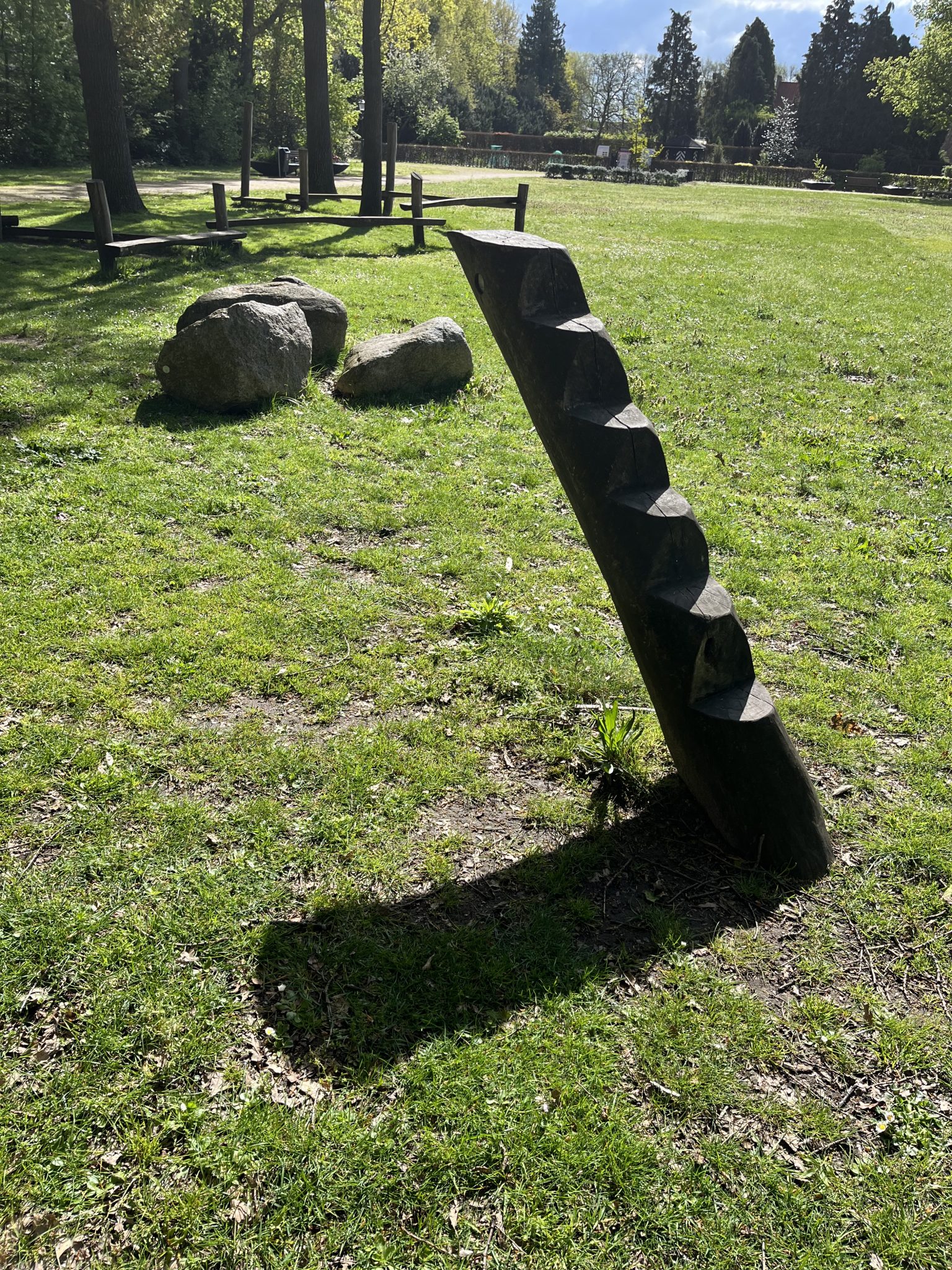 Alternative Text: A Woden pole in the gras with steps on it and it’s shade on the ground
