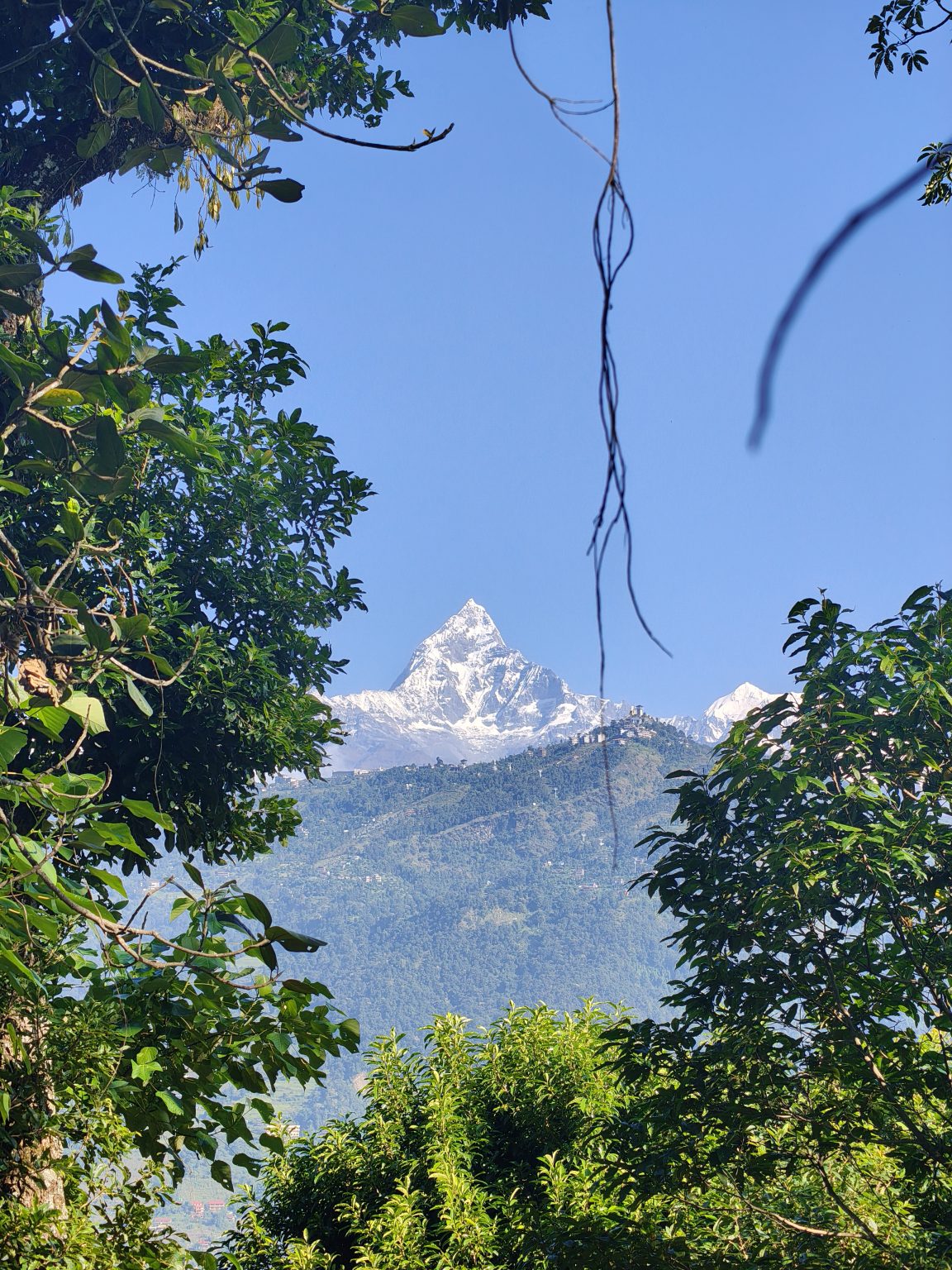 Alternative Text: A majestic snow-capped mountain peak rises against a clear blue sky, framed by lush green foliage.