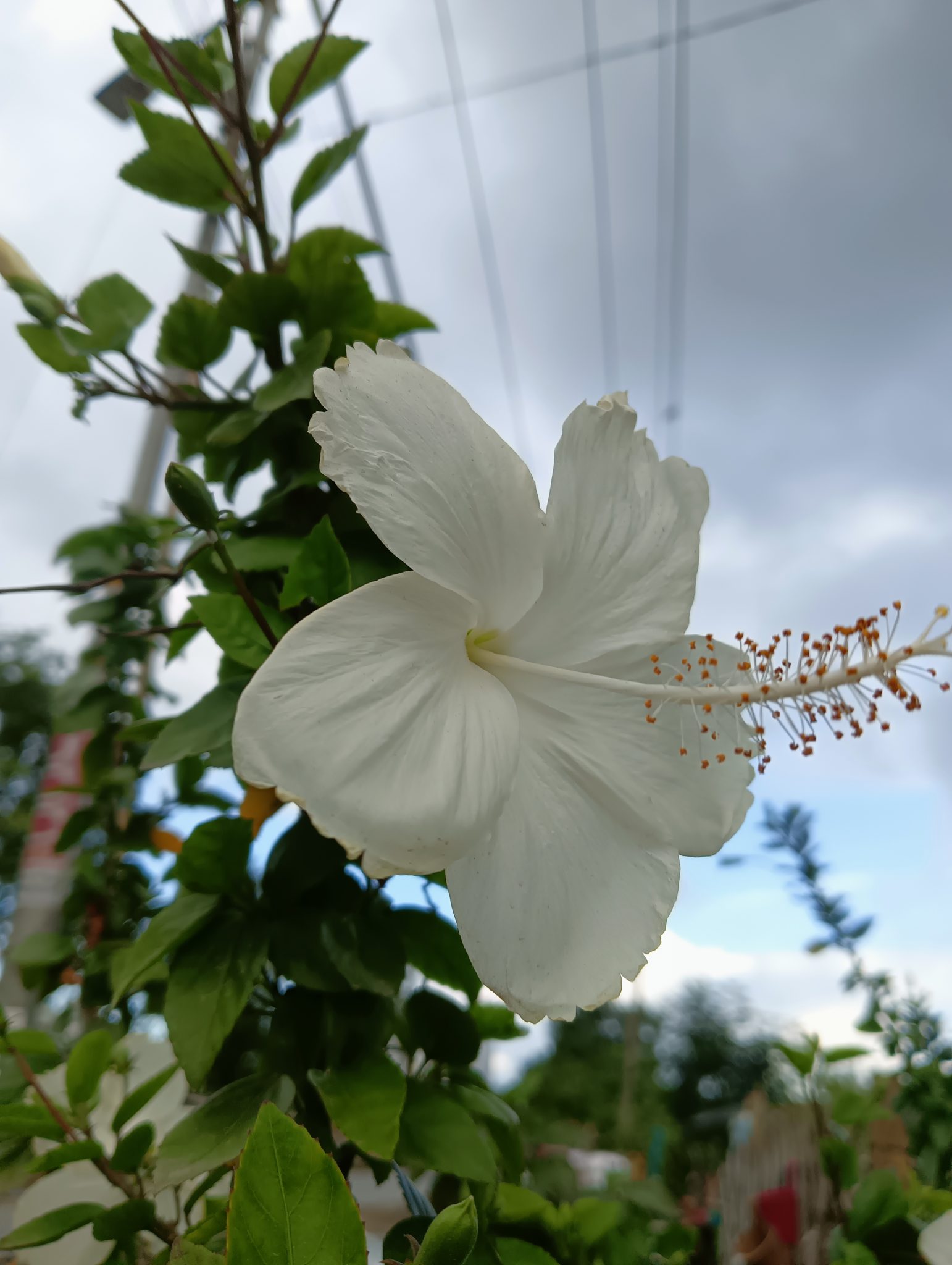 Alternative Text: A close-up of a white hibiscus flower with delicate petals, surrounded by green leaves.
