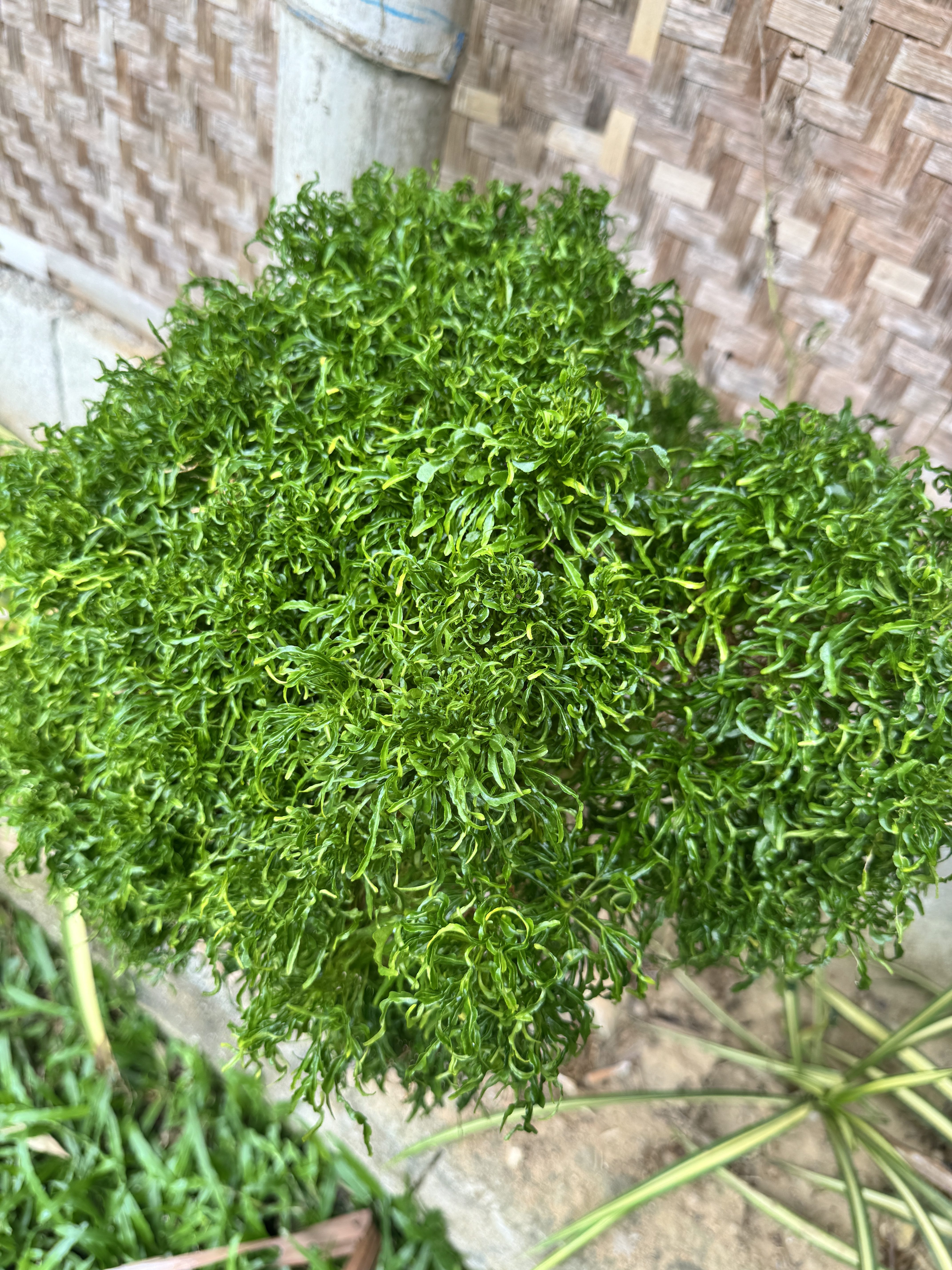 Alternative Text: A close-up, top-down view shows a vibrant green plant with unique, finely textured, curly leaves forming a dense, compact bush