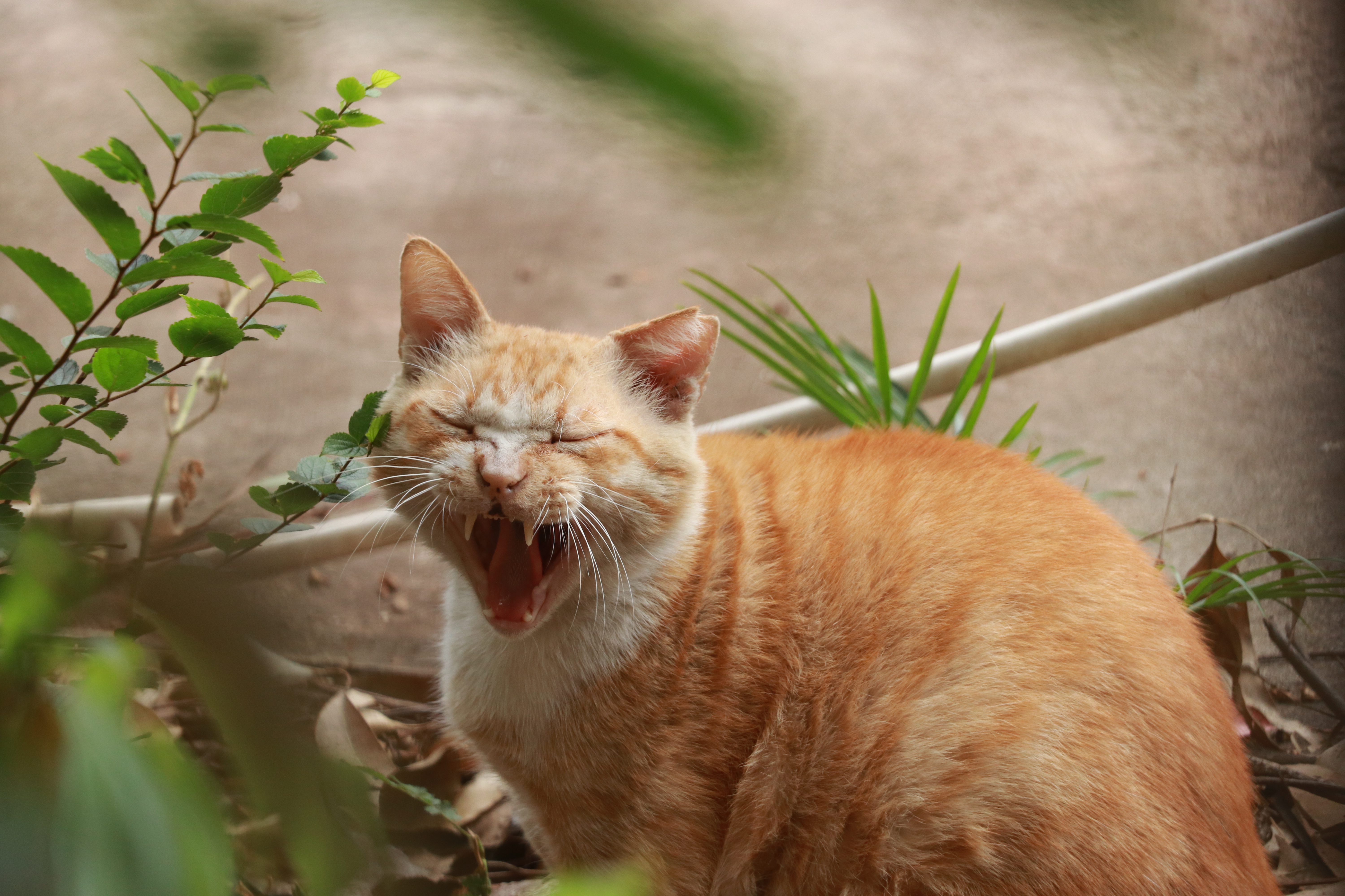 Alternative Text: A fluffy orange cat yawning, surrounded by greenery, with its eyes squinted and mouth wide open.