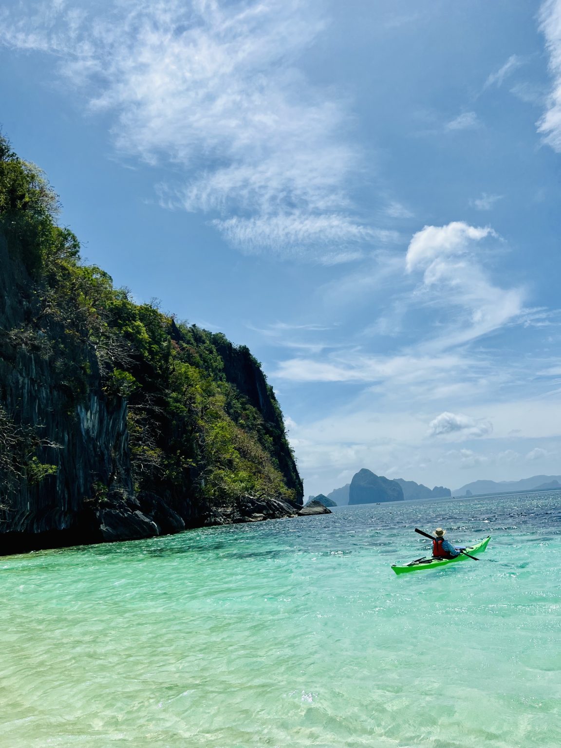 Alternative Text: Kayaker paddles in crystal-clear turquoise waters near a lush, rocky cliff under a vibrant blue sky.