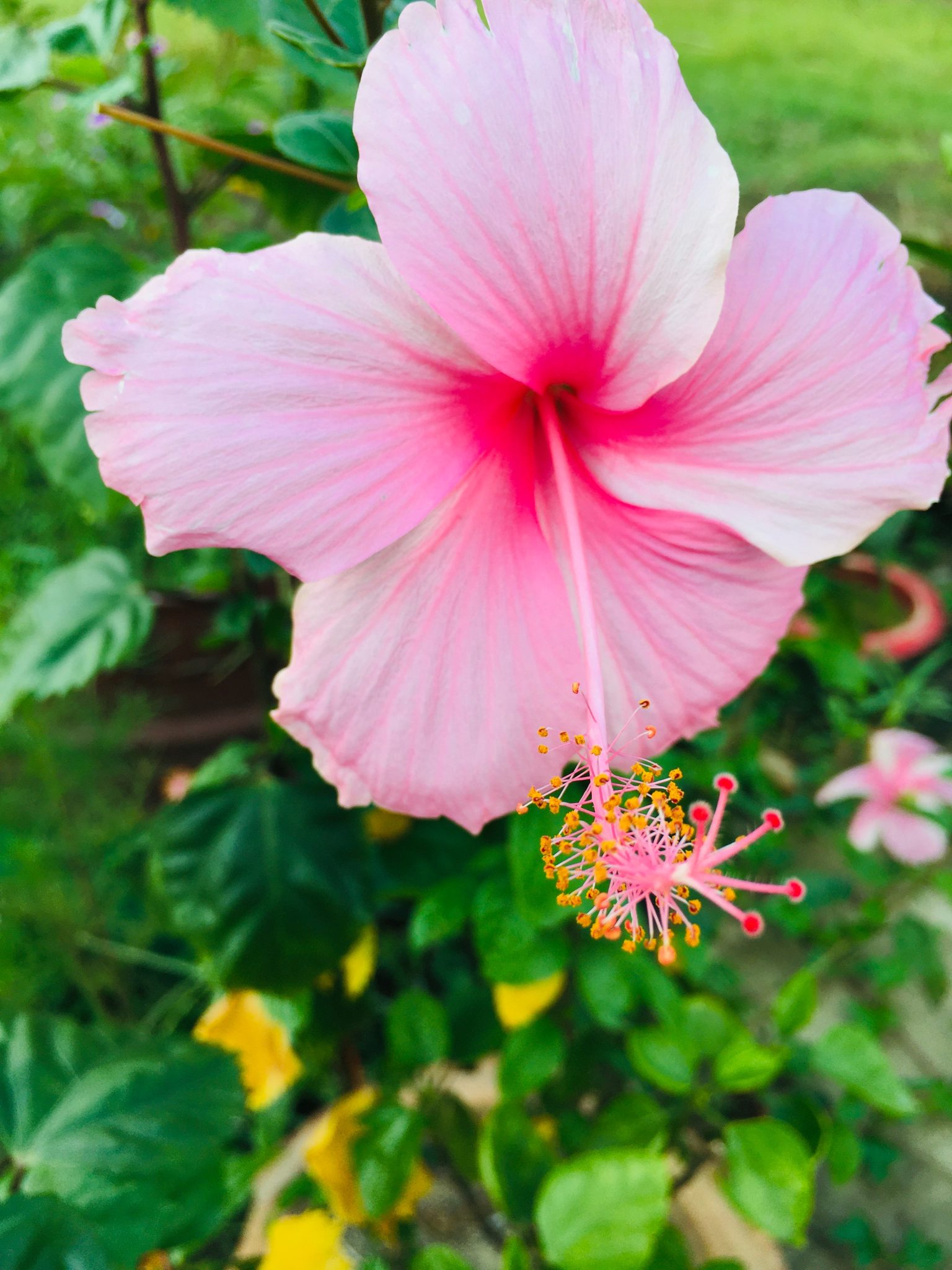 Alternative Text: A close-up of a pink hibiscus flower with slightly lighter pink petals and a vibrant red center.